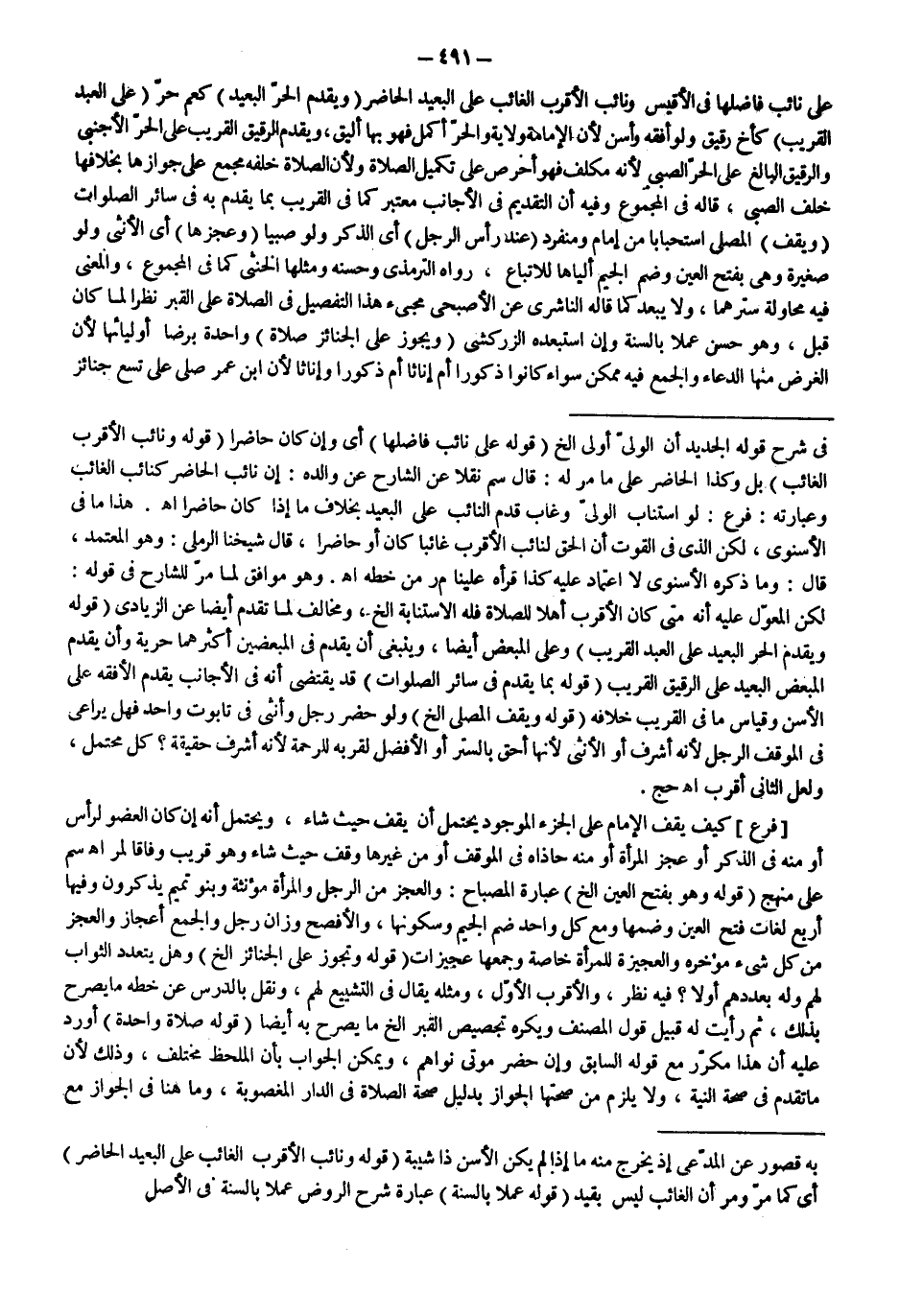 وَهُوَ مُوَافِقٌ لِمَا مَرَّ لِلشَّارِحِ فِي قَوْلِهِ: لَكِنَّ الْمُعَوَّلَ عَلَيْهِ أَنَّهُ مَتَى كَانَ الْأَقْرَبُ أَهْلًا لِلصَّلَاةِ فَلَهُ الِاسْتِنَابَةُ إلَخْ، وَمُخَالِفٌ لِمَا تَقَدَّمَ أَيْضًا عَنْ الزِّيَادِيِّ (قَوْلُهُ: وَيُقَدَّمُ الْحُرُّ الْبَعِيدُ عَلَى الْعَبْدِ الْقَرِيبِ) وَعَلَى الْمُبَعَّضِ أَيْضًا، وَيَنْبَغِي أَنْ يُقَدَّمَ فِي الْمُبَعَّضِينَ أَكْثَرُهُمَا حُرِّيَّةً وَأَنْ يُقَدَّمَ الْمُبَعَّضُ الْبَعِيدُ عَلَى الرَّقِيقِ الْقَرِيبِ (قَوْلُهُ: بِمَا يُقَدَّمُ فِي سَائِرِ الصَّلَوَاتِ) قَدْ يَقْتَضِي أَنَّهُ فِي الْأَجَانِبِ يُقَدَّمُ الْأَفْقَهُ عَلَى الْأَسَنِّ وَقِيَاسُ مَا فِي الْقَرِيبِ خِلَافُهُ.
