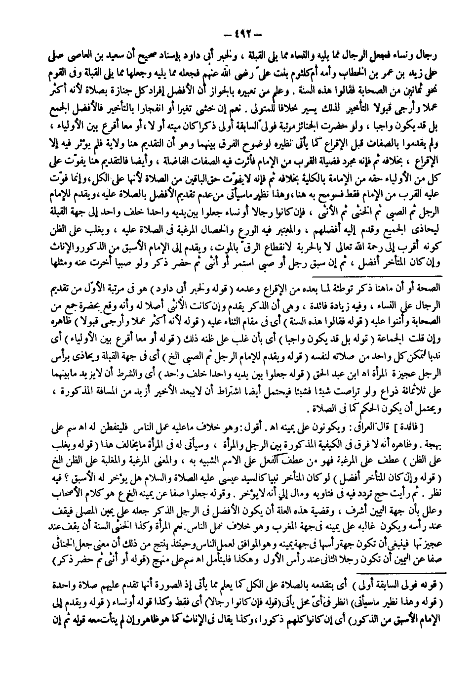 ـــــــــــــــــــــــــــــSالصِّحَّةِ أَوْ أَنَّ مَا هُنَا ذُكِرَ تَوْطِئَةً لِمَا بَعْدَهُ مِنْ الْإِقْرَاعِ وَعَدَمِهِ (قَوْلُهُ: وَلِخَبَرِ أَبِي دَاوُد) هُوَ فِي مَرْتَبَةِ الْأَوَّلِ مِنْ تَقْدِيمِ الرِّجَالِ عَلَى النِّسَاءِ، وَفِيهِ زِيَادَةُ فَائِدَةٍ، وَهِيَ أَنَّ الذَّكَرَ يُقَدَّمُ وَإِنْ كَانَتْ الْأُنْثَى أَصْلًا لَهُ وَأَنَّهُ وَقَعَ بِحَضْرَةِ جَمْعٍ مِنْ الصَّحَابَةِ وَأَثْنَوْا عَلَيْهِ (قَوْلُهُ: فَقَالُوا هَذِهِ السُّنَّةُ) أَيْ فِي مَقَامِ الثَّنَاءِ عَلَيْهِ (قَوْلُهُ: لِأَنَّهُ أَكْثَرُ عَمَلًا وَأَرْجَى قَبُولًا) ظَاهِرُهُ وَإِنْ قَلَّتْ الْجَمَاعَةُ (قَوْلُهُ: بَلْ قَدْ يَكُونُ وَاجِبًا) أَيْ بِأَنْ غَلَبَ عَلَى ظَنِّهِ ذَلِكَ (قَوْلُهُ: أَوْ مَعًا أَقْرَعَ بَيْنَ الْأَوْلِيَاءِ) أَيْ نَدْبًا لِتَمَكُّنِ كُلِّ وَاحِدٍ مِنْ صَلَاتِهِ لِنَفْسِهِ (قَوْلُهُ: وَيُقَدَّمُ لِلْإِمَامِ الرَّجُلُ ثُمَّ الصَّبِيُّ إلَخْ) أَيْ فِي جِهَةِ الْقِبْلَةِ وَيُحَاذَى بِرَأْسِ الرَّجُلِ عَجِيزَةُ الْمَرْأَةِ اهـ ابْنِ عَبْدِ الْحَقِّ (قَوْلُهُ: جَعَلُوا بَيْنَ يَدَيْهِ وَاحِدًا خَلْفَ وَاحِدٍ) أَيْ وَالشَّرْطُ أَنْ لَا يَزِيدَ مَا بَيْنَهُمَا عَلَى ثَلَاثِمِائَةِ ذِرَاعٍ وَلَوْ تَرَاصَّتْ شَيْئًا فَيَحْتَمِلُ أَيْضًا اشْتِرَاطُ أَنْ لَا يَبْعُدَ الْأَخِيرُ أَزْيَدَ مِنْ الْمَسَافَةِ الْمَذْكُورَةِ، وَيَحْتَمِلُ أَنْ يَكُونَ الْحُكْمُ كَمَا فِي الصَّلَاةِ.