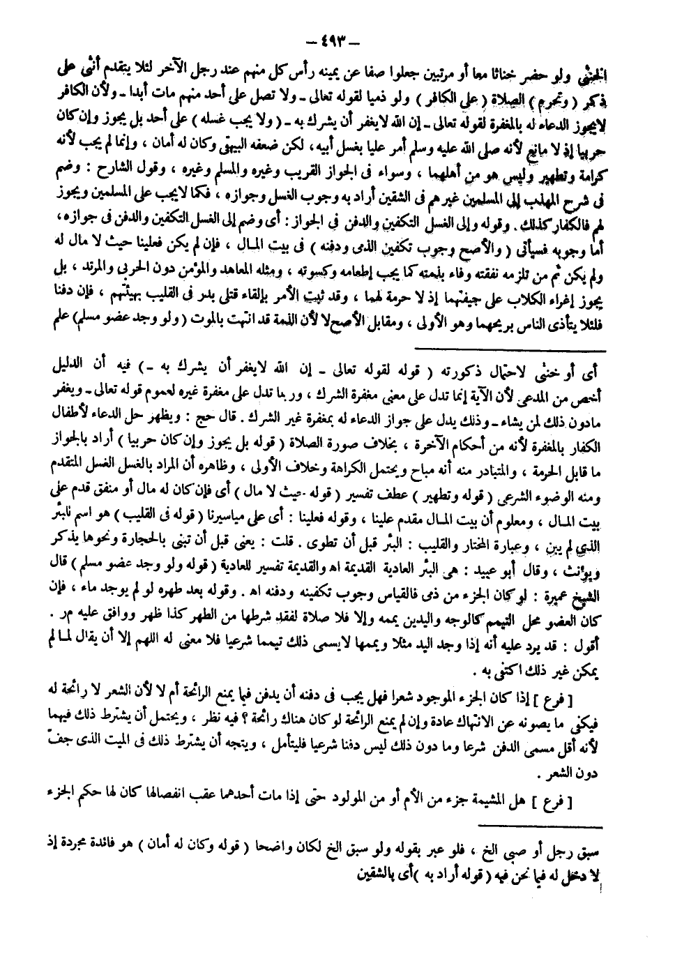 قَالَ حَجّ: وَيَظْهَرُ حِلُّ الدُّعَاءِ لِأَطْفَالِ الْكُفَّارِ بِالْمَغْفِرَةِ لِأَنَّهُ مِنْ أَحْكَامِ الْآخِرَةِ، بِخِلَافِ صُورَةِ الصَّلَاةِ (قَوْلُهُ: بَلْ يَجُوزُ وَإِنْ كَانَ حَرْبِيًّا) أَرَادَ بِالْجَوَازِ مَا قَابَلَ الْحُرْمَةَ، وَالْمُتَبَادِرُ مِنْهُ أَنَّهُ مُبَاحٌ وَيَحْتَمِلُ الْكَرَاهَةَ وَخِلَافَ الْأَوْلَى، وَظَاهِرُهُ أَنَّ الْمُرَادَ بِالْغُسْلِ الْغُسْلُ الْمُتَقَدِّمُ وَمِنْهُ الْوُضُوءُ الشَّرْعِيُّ (قَوْلُهُ: وَتَطْهِيرٌ) عَطْفُ تَفْسِيرٍ (قَوْلُهُ: حَيْثُ لَا مَالَ) أَيْ فَإِنْ كَانَ لَهُ مَالٌ أَوْ مُنْفَقٌ قُدِّمَ عَلَى بَيْتِ الْمَالِ، وَمَعْلُومٌ أَنَّ بَيْتَ الْمَالِ، مُقَدَّمٌ عَلَيْنَا، وَقَوْلُهُ فَعَلَيْنَا: أَيْ عَلَى مَيَاسِيرِنَا (قَوْلُهُ: فِي الْقَلِيبِ) هُوَ اسْمٌ لِلْبِئْرِ الَّذِي لَمْ يُبْنَ، وَعِبَارَةُ الْمُخْتَارِ وَالْقَلِيبُ: الْبِئْرُ قَبْلَ أَنْ تُطْوَى.