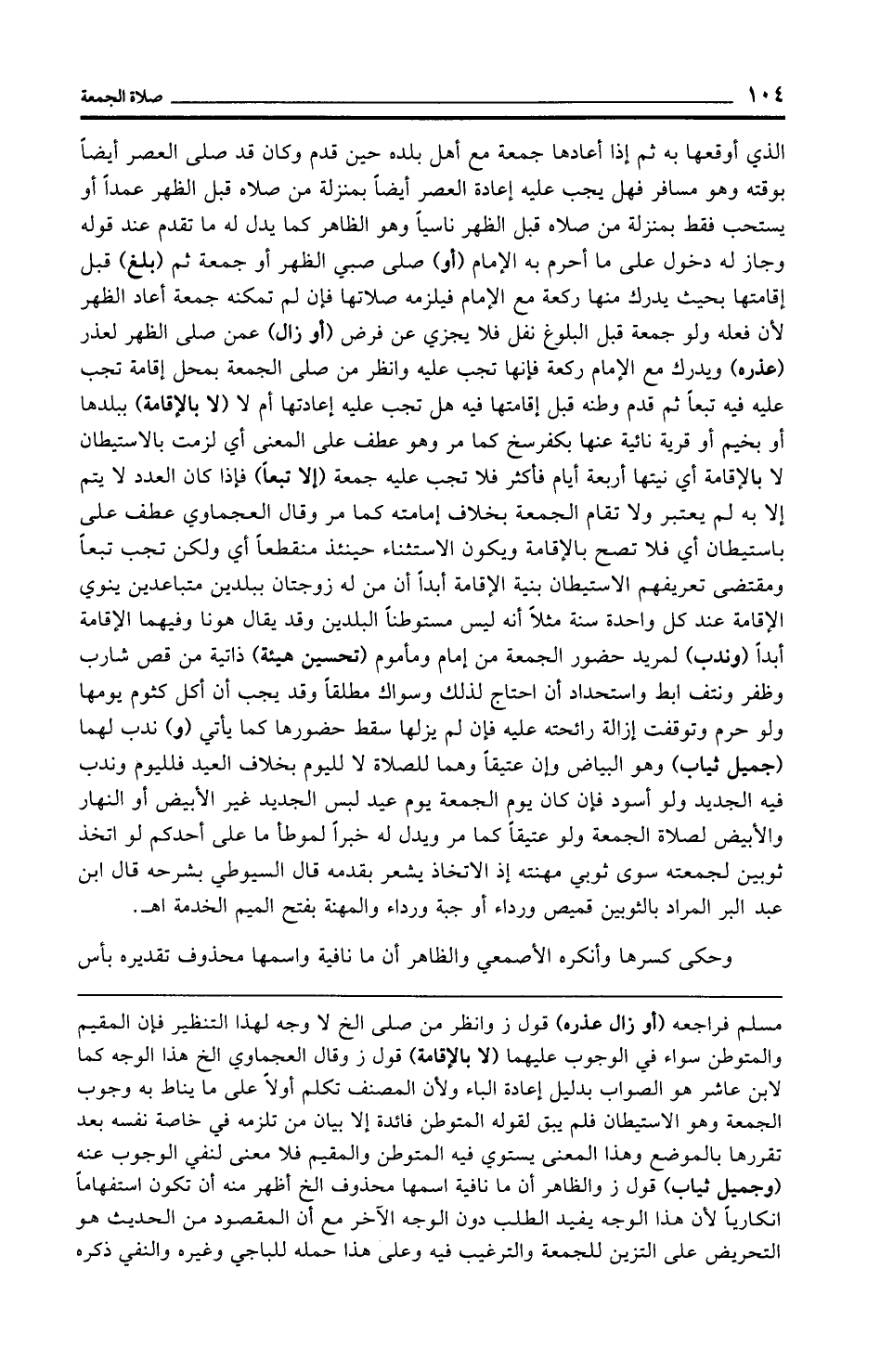 الذي أوقعها به ثم إذا أعادها جمعة مع أهل بلده حين قدم وكان قد صلى العصر أيضًا بوقته وهو مسافر فهل يجب عليه إعادة العصر أيضًا بمنزلة من صلاه قبل الظهر عمدًا أو يستحب فقط بمنزلة من صلاه قبل الظهر ناسيًا وهو الظاهر كما يدل له ما تقدم عند قوله وجاز له دخول على ما أحرم به الإِمام (أو) صلى صبي الظهر أو جمعة ثم (بلغ) قبل إقامتها بحيث يدرك منها ركعة مع الإِمام فيلزمه صلاتها فإن لم تمكنه جمعة أعاد الظهر لأن فعله ولو جمعة قبل البلوغ نفل فلا يجزي عن فرض (أو زال) عمن صلى الظهر لعذر (عذره) ويدرك مع الإِمام ركعة فإنها تجب عليه وانظر من صلى الجمعة بمحل إقامة تجب عليه فيه تبعًا ثم قدم وطنه قبل إقامتها فيه هل تجب عليه إعادتها أم لا (لا بالإقامة) ببلدها أو بخيم أو قرية نائية عنها بكفرسخ كما مر وهو عطف على المعنى أي لزمت بالاستيطان لا بالإقامة أي نيتها أربعة أيام فأكثر فلا تجب عليه جمعة (إلا تبعًا) فإذا كان العدد لا يتم إلا به لم يعتبر ولا تقام الجمعة بخلاف إمامته كما مر وقال العجماوي عطف على باستيطان أي فلا تصح بالإقامة ويكون الاستثناء حينئذ منقطعًا أي ولكن تجب تبعًا ومقتضى تعريفهم الاستيطان بنية الإقامة أبدًا أن من له زوجتان ببلدين متباعدين ينوي الإقامة عند كل واحدة سنة مثلًا أنه ليس مستوطنًا البلدين وقد يقال هونا وفيهما الإقامة أبدًا (وندب) لمريد حضور الجمعة من إمام ومأموم (تحسين هيئة) ذاتية من قص شارب وظفر ونتف إبط واستحداد أن احتاج لذلك وسواك مطلقًا وقد يجب أن أكل كثوم يومها ولو حرم وتوقفت إزالة رائحته عليه فإن لم يزلها سقط حضورها كما يأتي (و) ندب لهما (جميل ثياب) وهو البياض وإن عتيقًا وهما للصلاة لا لليوم بخلاف العيد فلليوم وندب فيه الجديد ولو أسود فإن كان يوم الجمعة يوم عيد لبس الجديد غير الأبيض أو النهار والأبيض لصلاة الجمعة ولو عتيقًا كما مر ويدل له خبرًا لموطأ ما على أحدكم لو اتخذ ثوبين لجمعته سوى ثوبي مهنته إذ الاتخاذ يشعر بقدمه قال السيوطي بشرحه قال ابن عبد البر المراد بالثوبين قميص ورداء أو جبة ورداء والمهنة بفتح الميم الخدمة اهـ.