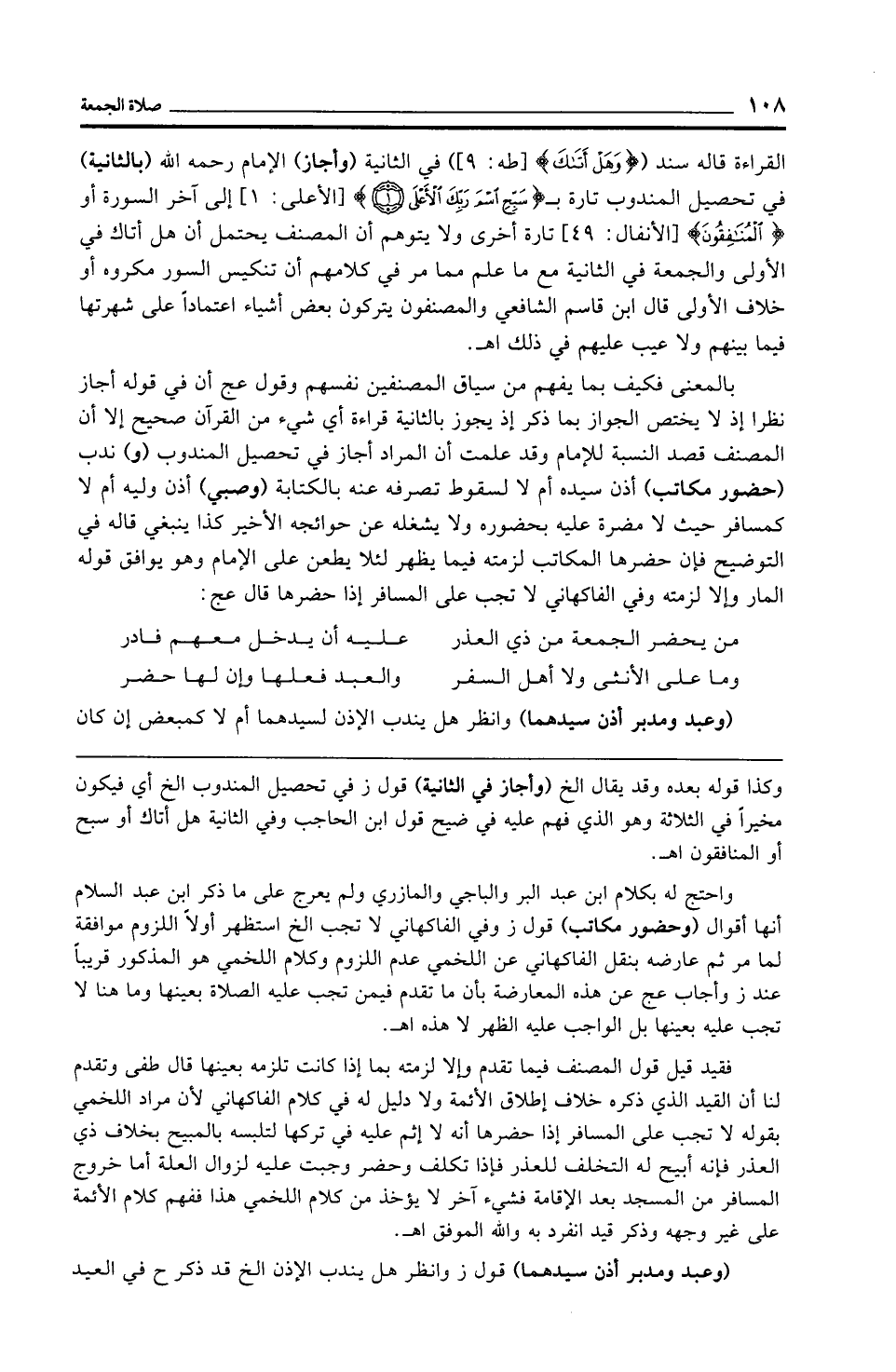 بالمعنى فكيف بما يفهم من سياق المصنفين نفسهم وقول عج أن في قوله أجاز نظرا إذ لا يختص الجواز بما ذكر إذ يجوز بالثانية قراءة أي شيء من القرآن صحيح إلا أن المصنف قصد النسبة للإمام وقد علمت أن المراد أجاز في تحصيل المندوب (و) ندب (حضور مكاتب) أذن سيده أم لا لسقوط تصرفه عنه بالكتابة (وصبي) أذن وليّه أم لا كمسافر حيث لا مضرة عليه بحضوره ولا يشغله عن حوائجه الأخير كذا ينبغي قاله في التوضيح فإن حضرها المكاتب لزمته فيما يظهر لئلا يطعن علي الإِمام وهو يوافق قوله المار وإلا لزمته وفي الفاكهاني لا تجب على المسافر إذا حضرها قال عج: