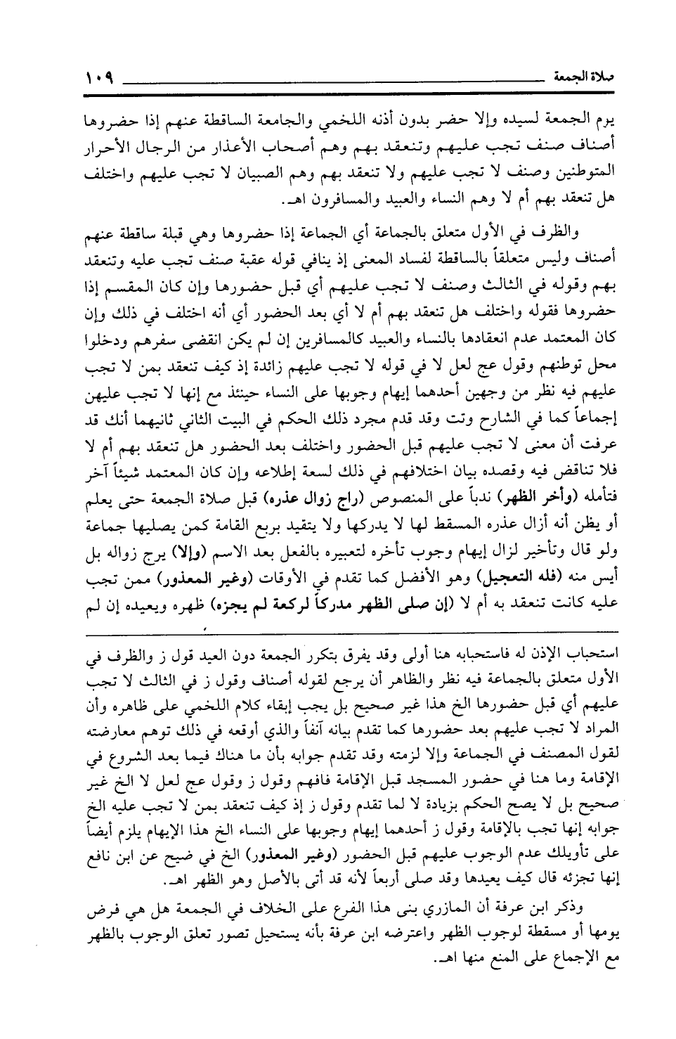 استحباب الإذن له فاستحبابه هنا أولى وقد يفرق بتكرر الجمعة دون العيد قول ز والظرف في الأول متعلق بالجماعة فيه نظر والظاهر أن يرجع لقوله أصناف وقول ز في الثالث لا تجب عليهم أي قبل حضورها الخ هذا غير صحيح بل يجب إبقاء كلام اللخمي على ظاهره وأن المراد لا تجب عليهم بعد حضورها كما تقدم بيانه آنفًا والذي أوقعه في ذلك توهم معارضته لقول المصنف في الجماعة وإلا لزمته وقد تقدم جوابه بأن ما هناك فيما بعد الشروع في الإقامة وما هنا في حضور المسجد قبل الإقامة فافهم وقول ز وقول عج لعل لا الخ غير صحيح بل لا يصح الحكم بزيادة لا لما تقدم وقول ز إذ كيف تنعقد بمن لا تجب عليه الخ جوابه إنها تجب بالإقامة وقول ز أحدهما إيهام وجوبها على النساء الخ هذا الإيهام يلزم أيضًا على تأويلك عدم الوجوب عليهم قبل الحضور (وغير المعذور) الخ في ضيح عن ابن نافع إنها تجزئه قال كيف يعيدها وقد صلى أربعًا لأنه قد أتى بالأصل وهو الظهر اهـ.