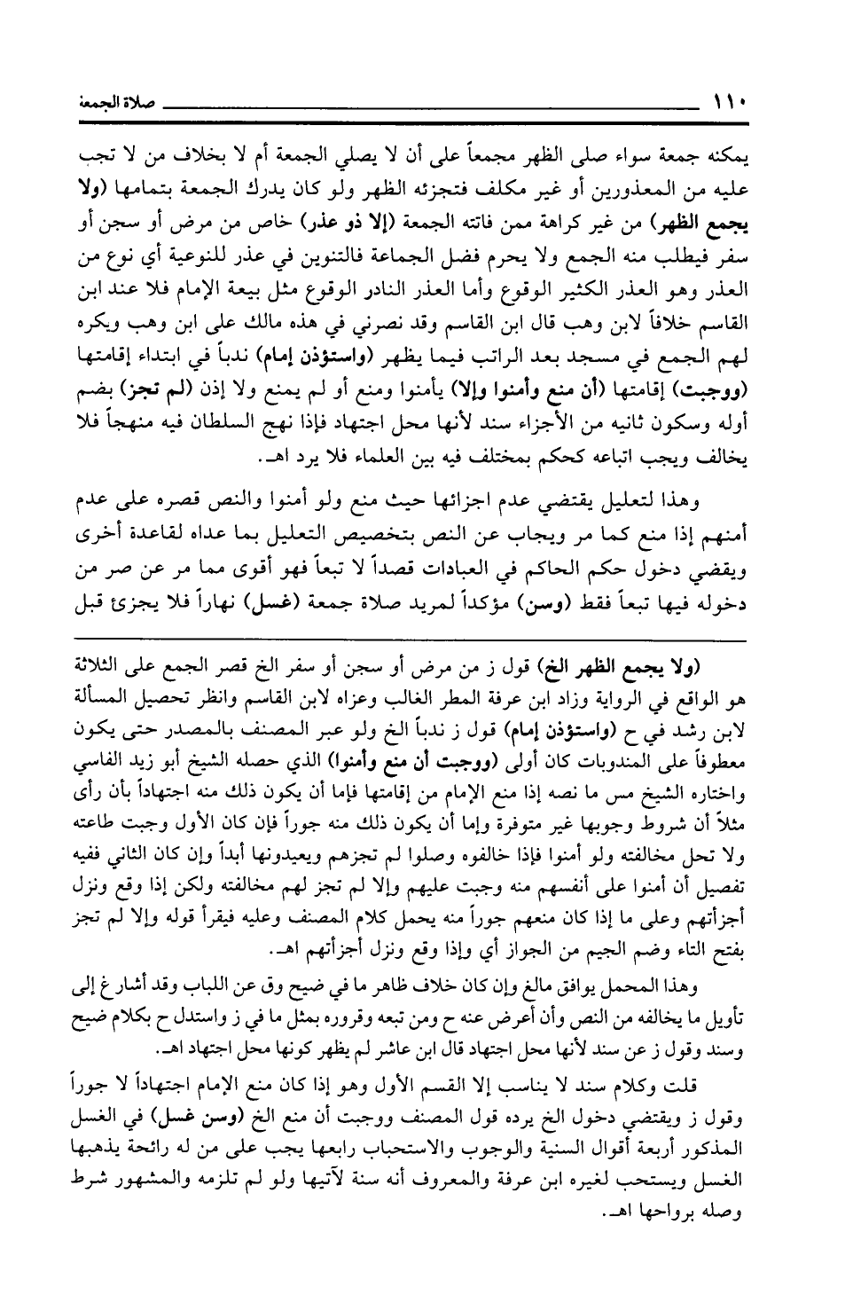 يمكنه جمعة سواء صلى الظهر مجمعًا على أن لا يصلي الجمعة أم لا بخلاف من لا تجب عليه من المعذورين أو غير مكلف فتجزئه الظهر ولو كان يدرك الجمعة بتمامها (ولا يجمع الظهر) من غير كراهة ممن فاتته الجمعة (إلا ذو عذر) خاص من مرض أو سجن أو سفر فيطلب منه الجمع ولا يحرم فضل الجماعة فالتنوين في عذر للنوعية أي نوع من العذر وهو العذر الكثير الوقوع وأما العذر النادر الوقوع مثل بيعة الإِمام فلا عند ابن القاسم خلافًا لابن وهب قال ابن القاسم وقد نصرني في هذه مالك على ابن وهب ويكره لهم الجمع في مسجد بعد الراتب فيما يظهر (واستؤذن إمام) ندبًا في ابتداء إقامتها (ووجبت) إقامتها (أن منع وأمنوا وإلا) يأمنوا ومنع أو لم يمنع ولا إذن (لم تجز) بضم أوله وسكون ثانيه من الأجزاء سند لأنها محل اجتهاد فإذا نهج السلطان فيه منهجًا فلا يخالف ويجب اتباعه كحكم بمختلف فيه بين العلماء فلا يرد اهـ.