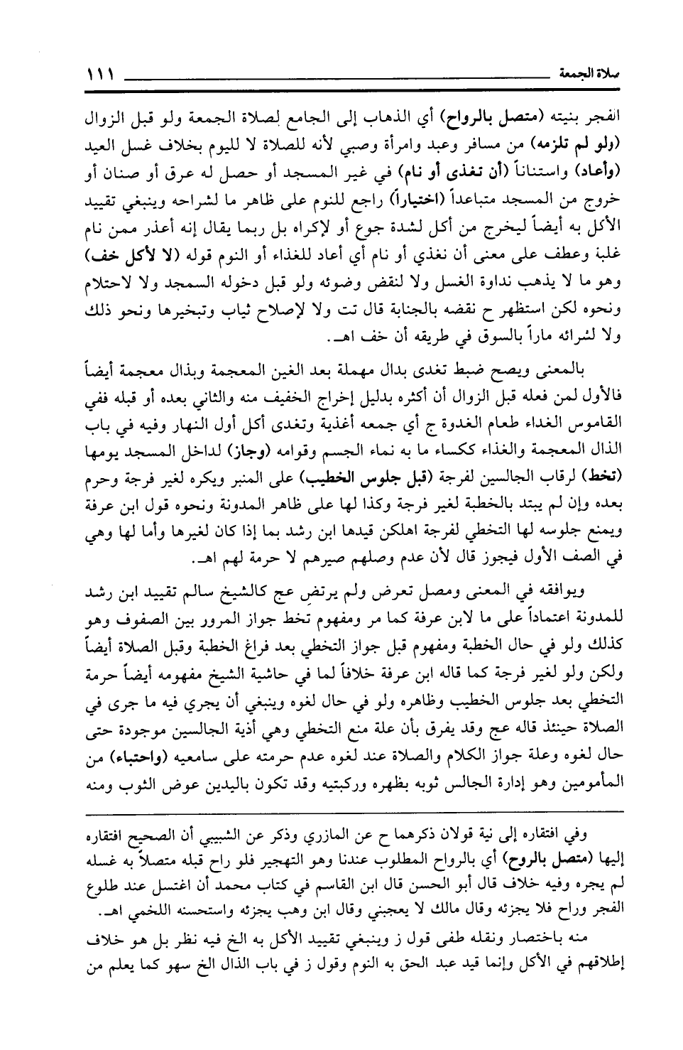 ويوافقه في المعنى ومصل تعرض ولم يرتضِ عج كالشيخ سالم تقييد ابن رشد للمدونة اعتمادًا على ما لابن عرفة كما مر ومفهوم تخط جواز المرور بين الصفوف وهو كذلك ولو في حال الخطبة ومفهوم قبل جواز التخطي بعد فراغ الخطبة وقبل الصلاة أيضًا ولكن ولو لغير فرجة كما قاله ابن عرفة خلافًا لما في حاشية الشيخ مفهومه أيضًا حرمة التخطي بعد جلوس الخطيب وظاهره ولو في حال لغوه وينبغي أن يجري فيه ما جرى في الصلاة حينئذ قاله عج وقد يفرق بأن علة منع التخطي وهي أذية الجالسين موجودة حتى حال لغوه وعلة جواز الكلام والصلاة عند لغوه عدم حرمته على سامعيه (واحتباء) من المأمومين وهو إدارة المجالس ثوبه بظهره وركبتيه وقد تكون باليدين عوض الثوب ومنه