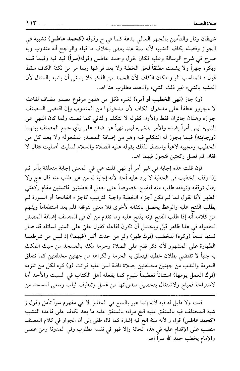 شيطان ونار والتأمين بالجهر العالي بدعة كما في ح وقوله (كحمد عاطس) تشبيه في الجواز وفصله بكاف التشبيه لأنه سنة عند بعض بخلاف ما قبله والراجح أنه مندوب وبه صرح في شرح الرسالة وعليه فكان يقول وحمد عاطس وقوله (سرًّا) قيد فيه وفيما قبله ويكره جهرًا ولا يشمت مطلقًا لحق الخطبة ولا بعد فراغها وبما مر من نكتة الكاف سقط قول د المناسب الواو مكان الكاف لأن الحمد من الذكر فلا ينبغي أن يشبه بالمثال لأن المشبه بالشيء غير ذلك الشيء والحمد مطلوب هنا اهـ.