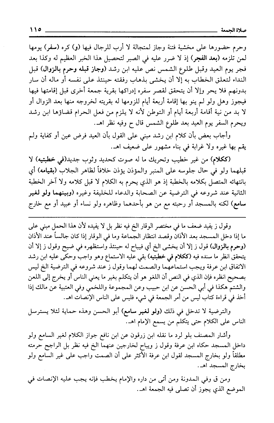 وقول ز يفيد ضعف ما في مختصر الوقار الخ فيه نظر بل لا يفيده لأن هذا العمل مبني على ما إذا دخل المسجد بعد الأذان وقصد انتظار الجماعة وما في الوقار إذا كان جالسًا عند الأذان (وحرم بالزوال) قول ز إلا أن يخشى الخ أي فيباح له حينئذ واستظهره في ضيح وقول ز إلا أن يتحقق انظر ما سنده فيه (ككلام في خطبتيه) بقي عليه الاستماع وهو واجب وحكى عليه ابن رشد الاتفاق ابن عرفة ويجب استماعهما والصمت لهما وقول ز عند شروعه في الترضية الخ ليس بصحيح انظره فإن الذي في النص أن اللغو هو أن يتكلم بغير ما يعني الناس أو يخرج إلى اللعن والشتم هكذا في أبي الحسن عن ابن حبيب وعن المجموعة واللخمي وفي العتبية عن مالك إذا أخذ في قراءة كتاب ليس من أمر الجمعة في شيء فليس على الناس الإنصات اهـ.