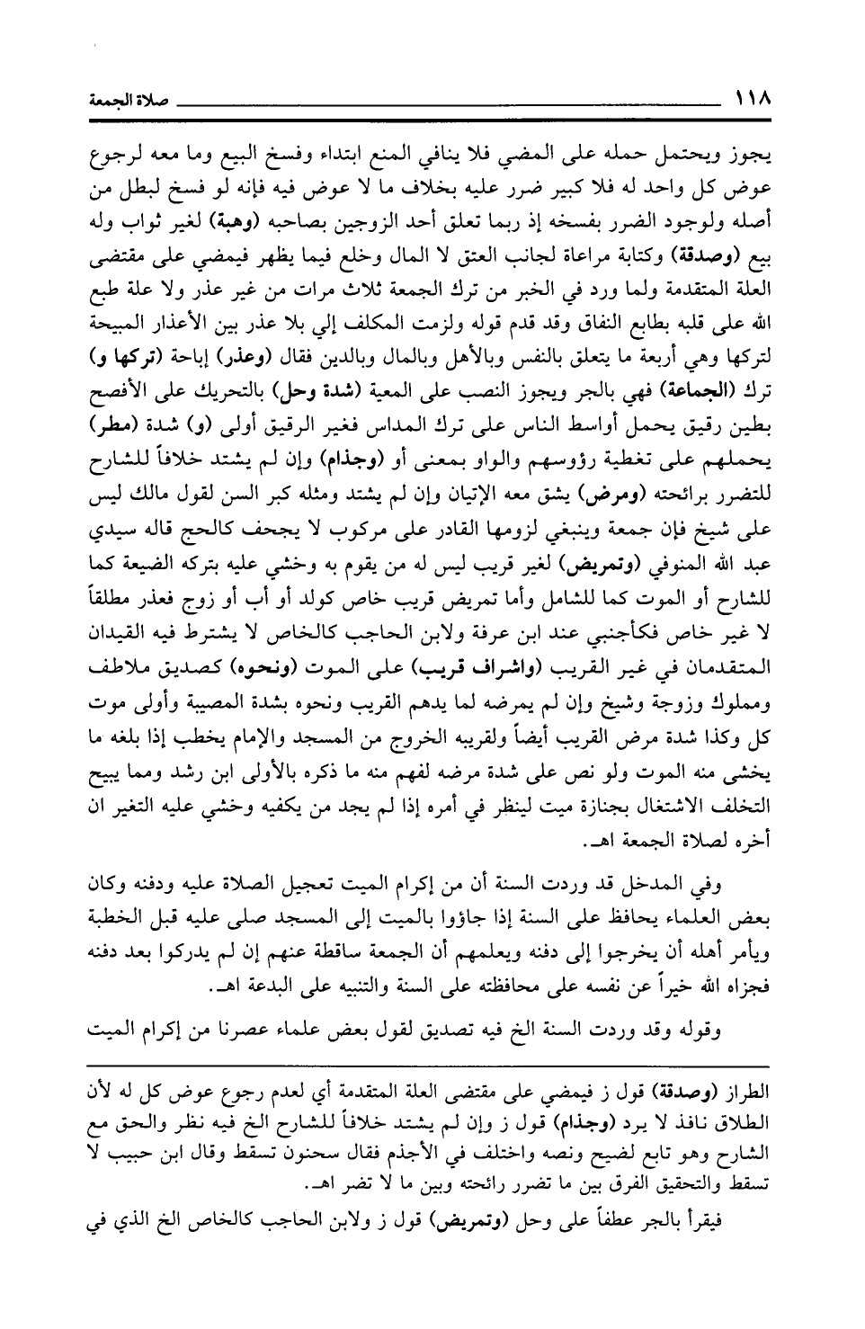 يجوز ويحتمل حمله على المضي فلا ينافي المنع ابتداء وفسخ البيع وما معه لرجوع عوض كل واحد له فلا كبير ضرر عليه بخلاف ما لا عوض فيه فإنه لو فسخ لبطل من أصله ولوجود الضرر بفسخه إذ ربما تعلق أحد الزوجين بصاحبه (وهبة) لغير ثواب وله بيع (وصدقة) وكتابة مراعاة لجانب العتق لا المال وخلع فيما يظهر فيمضي على مقتضى العلة المتقدمة ولما ورد في الخبر من ترك الجمعة ثلاث مرات من غير عذر ولا علة طبع الله على قلبه بطابع النفاق وقد قدم قوله ولزمت المكلف إلى بلا عذر بين الأعذار المبيحة لتركها وهي أربعة ما يتعلق بالنفس وبالأهل وبالمال وبالدين فقال (وعذر) إباحة (تركها و) ترك (الجماعة) فهي بالجر ويجوز النصب على المعية (شدة وحل) بالتحريك على الأفصح بطين رقيق يحمل أواسط الناس على ترك المداس فغير الرقيق أولى (و) شدة (مطر) يحملهم على تغطية رؤوسهم والواو بمعنى أو (وجذام) وإن لم يشتد خلافًا للشارح للتضرر برائحته (ومرض) يشق معه الإتيان وإن لم يشتد ومثله كبر السنن لقول مالك ليس على شيخ فإن جمعة وينبغي لزومها القادر على مركوب لا يجحف كالحج قاله سيدي عبد الله المنوفي (وتمريض) لغير قريب ليس له من يقوم به وخشي عليه بتركه الضيعة كما للشارح أو الموت كما للشامل وأما تمريض قريب خاص كولد أو أب أو زوج فعذر مطلقًا لا غير خاص فكأجنبي عند ابن عرفة ولابن الحاجب كالخاص لا يشترط فيه القيدان المتقدمان في غير القريب (وإشراف قريب) على الموت (ونحوه) كصديق ملاطف ومملوك وزوجة وشيخ وإن لم يمرضه لما يدهم القريب ونحوه بشدة المصيبة وأولى موت كل وكذا شدة مرض القريب أيضًا ولقريبه الخروج من المسجد والإمام يخطب إذا بلغه ما يخشى منه الموت ولو نص على شدة مرضه لفهم منه ما ذكره بالأولى ابن رشد ومما يبيح التخلف الاشتغال بجنازة ميت لينظر في أمره إذا لم يجد من يكفيه وخشي عليه التغير ان آخره لصلاة الجمعة اهـ.