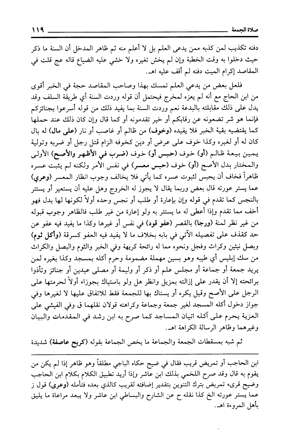 فلعل بعض من يدعي العلم تمسك بهذا وصاحب المقاصد حجة في الخبر أقوى من ابن الحاج مع أنه لم يعزه لمخرج فيحتمل أن قوله وردت السنة أي طريقة السلف وقد يدل على ذلك مقابلته بالبدعة نعم وردت السنة بما يفيد ذلك من قوله أسرعوا بجنائزكم فإنما هو شر تضعونه عن رقابكم أو خير تقدمونه أو كما قال وإن كان ذلك عند حملها كما يقتضيه بقية الخبر فلا يفيده (وخوف) من ظالم أو غاصب أو نار (على مال) له بال كان له أو لغيره وكذا خوف على عرض أو دين كخوفه الزام قتل رجل أو ضربه وتولية يمين بيعة ظالم (أو) خوف (حبس أو) خوف (ضرب في الأظهر والأصح) الأولى والمختار بدل الأصح (أو) خوف (حبس معسر) في نفس الأمر ولكنه لم يثبت عسره ظاهرًا فخاف أن يحبس لثبوت عسره كما يأتي فلا يخالف وجوب إنظار المعسر (وعري) عما يستر عورته قال بعض وربما يقال لا يجوز له الخروج وهل عليه أن يستعير أو يستتر بالنجس كما تقدم في قوله وإن بإعارة أو طلب أو نجس وحده أولًا لكونها لها بدل فهو أخف مما تقدم وإذا أعطى له ما يستتر به ولو إعارة من غير طلب فالظاهر وجوب قبوله من غير نظر لمنة (ورجا) بالقصر (عفو قود) في نفس أو غيرها وكذا ما يفيد فيه عفو عن حد كقذف على تفصيله الآتي في بابه بخلاف ما لا يفيد فيه العفو كسرقة (وأكل ثوم) وبصل نيئين وكراث وفجل ونحوه مما له رائحة كريهة وفي الخبر والثوم والبصل والكراث من سك إبليس أي طيبه وهو بسين مهملة مضمومة وحرم أكله بمسجد وكذا بغيره لمن يريد جمعة أو جماعة أو مجلس علم أو ذكر أو وليمة أو مصلى عيدين أو جنائز وتأذوا برائحته إلا أن يقدر على إزالته بمزيل وانظر هل ولو باستياك بجوزاء أولًا لحرمتها على الرجل على الأصح وقيل يكره أو يستاك بها للجمعة فقط للاتفاق عليها لا لغيرها وفي جواز دخول أكله المسجد لغير جمعة وجماعة وكراهته قولان نقلهما ق وفي الفيشي على العزية يحرم على آكله إتيان المساجد كما صرح به ابن رشد في المقدمات والبيان وغيرهما وظاهر الرسالة الكراهة اهـ.