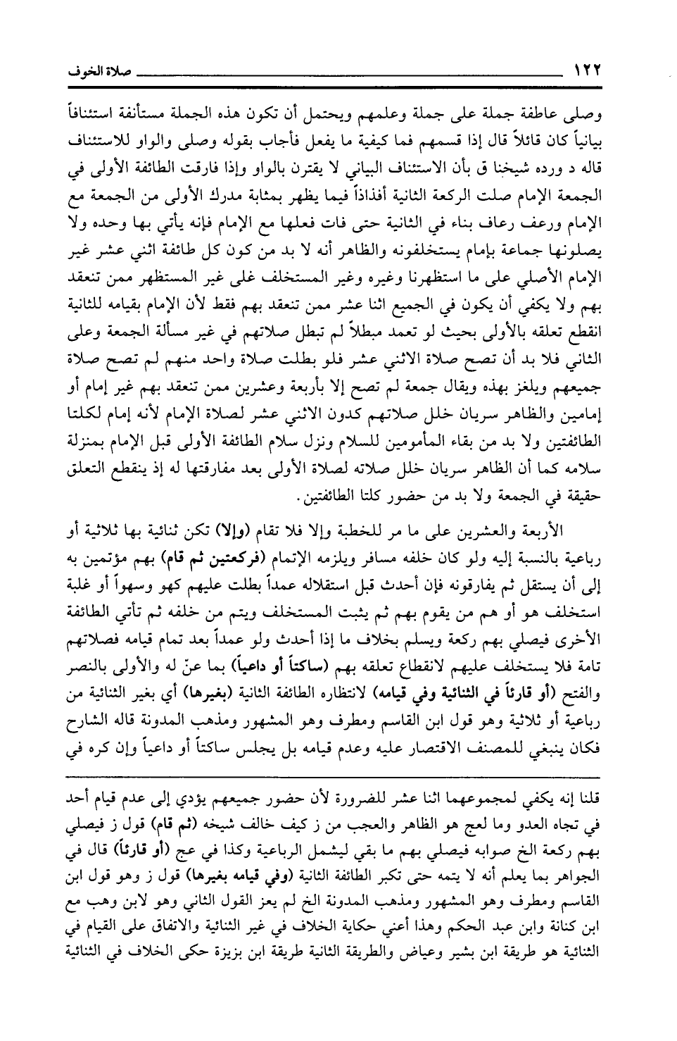وصلى عاطفة جملة على جملة وعلمهم ويحتمل أن تكون هذه الجملة مستأنفة استئنافًا بيانيًّا كان قائلًا قال إذا قسمهم فما كيفية ما يفعل فأجاب بقوله وصلى والواو للاستئناف قاله د ورده شيخنا ق بأن الاستئناف البياني لا يقترن بالواو وإذا فارقت الطائفة الأولى في الجمعة الإِمام صلت الركعة الثانية أفذاذًا فيما يظهر بمثابة مدرك الأولى من الجمعة مع الإِمام ورعف رعاف بناء في الثانية حتى فات فعلها مع الإِمام فإنه يأتي بها وحده ولا يصلونها جماعة بإمام يستخلفونه والظاهر أنه لا بد من كون كل طائفة اثني عشر غير الإِمام الأصلي على ما استظهرنا وغيره وغير المستخلف على غير المستظهر ممن تنعقد بهم ولا يكفي أن يكون في الجميع اثنا عشر ممن تنعقد بهم فقط لأن الإِمام بقيامه للثانية انقطع تعلقه بالأولى بحيث لو تعمد مبطلًا لم تبطل صلاتهم في غير مسألة الجمعة وعلى الثاني فلا بد أن تصح صلاة الاثني عشر فلو بطلت صلاة واحد منهم لم تصح صلاة جميعهم ويلغز بهذه ويقال جمعة لم تصح إلا بأربعة وعشرين ممن تنعقد بهم غير إمام أو إمامين والظاهر سريان خلل صلاتهم كدون الاثني عشر لصلاة الإِمام لأنه إمام لكلتا الطائفتين ولا بد من بقاء المأمومين للسلام ونزل سلام الطائفة الأولى قبل الإِمام بمنزلة سلامه كما أن الظاهر سريان خلل صلاته لصلاة الأولى بعد مفارقتها له إذ ينقطع التعلق حقيقة في الجمعة ولا بد من حضور كلتا الطائفتين.
