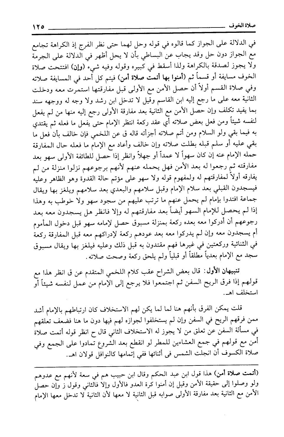 قلت يمكن الفرق بأنهم هنا لما لما يكن لهم الاستخلاف كان ارتباطهم بالإمام أشد ممن فرقهم الريح في السفن وإن لم يستخلفوا لجوازه لهم فيها دون ما هنا فضعف تعلقهم في مسألة السفن عن تعلق من لا يجوز له الاستخلاف الثاني قال ح انظر قوله أتمت صلاة أمن مع قولهم في جمع العشاءين للمطر لو انقطع بعد الشروع تمادوا على الجمع وفي صلاة الكسوف أن انجلت الشمس في أثنائها ففي إتمامها كالنوافل قولان اهـ.