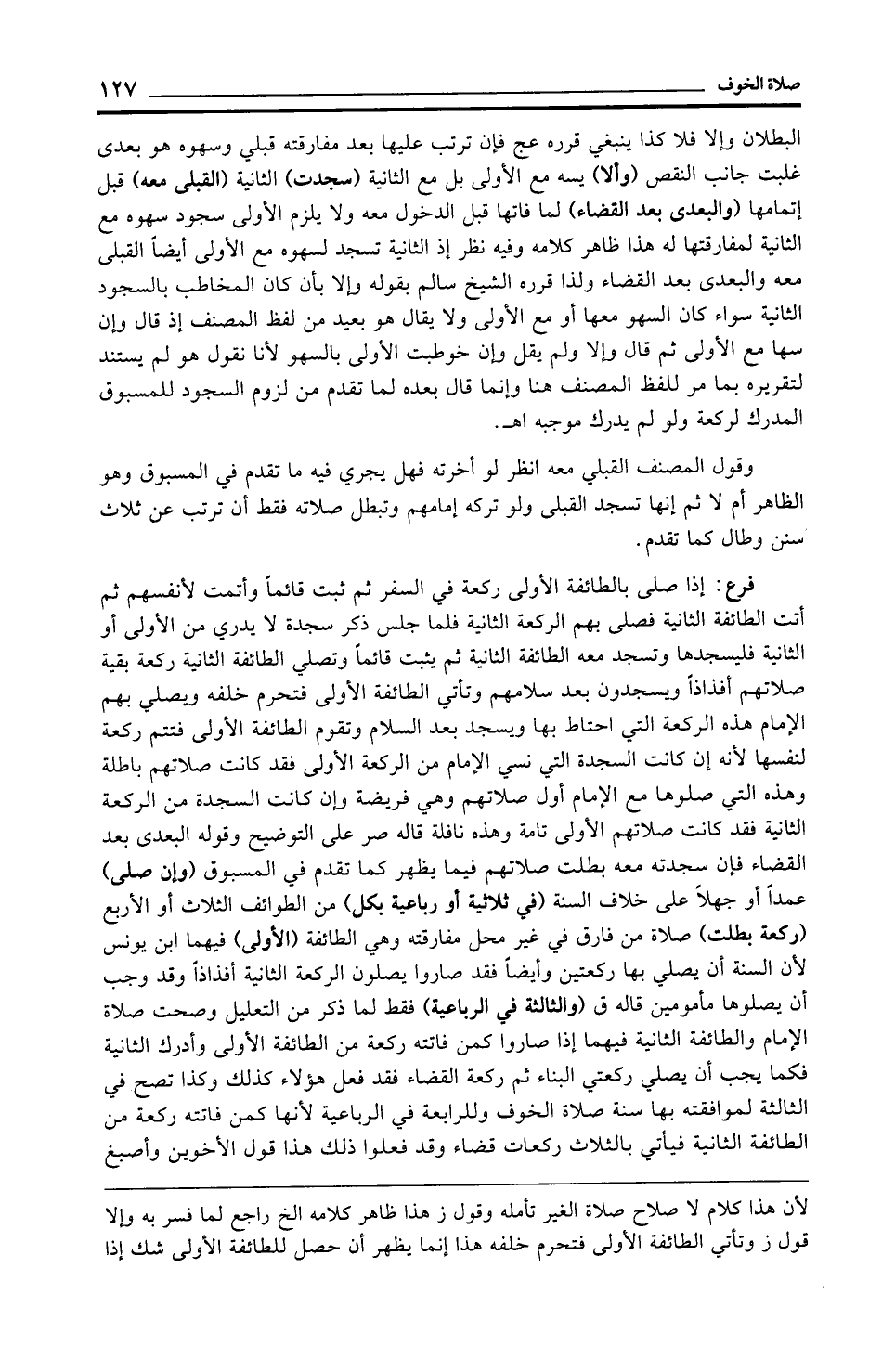 فرع: إذا صلى بالطائفة الأولى ركعة في السفر ثم ثبت قائمًا وأتمت لأنفسهم ثم أتت الطائفة الثانية فصلى بهم الركعة الثانية فلما جلس ذكر سجدة لا يدري من الأولى أو الثانية فليسجدها وتسجد معه الطائفة الثانية ثم يثبت قائمًا وتصلي الطائفة الثانية ركعة بقية صلاتهم أفذاذًا ويسجدون بعد سلامهم وتأتي الطائفة الأولى فتحرم خلفه ويصلي بهم الإِمام هذه الركعة التي احتاط بها ويسجد بعد السلام وتقوم الطائفة الأولى فتتم ركعة لنفسها لأنه إن كانت السجدة التي نسي الإِمام من الركعة الأولى فقد كانت صلاتهم باطلة وهذه التي صلوها مع الإِمام أول صلاتهم وهي فريضة وإن كانت السجدة من الركعة الثانية فقد كانت صلاتهم الأولى تامة وهذه نافلة قاله صر على التوضيح وقوله البعدى بعد القضاء فإن سجدته معه بطلت صلاتهم فيما يظهر كما تقدم في المسبوق (وإن صلى) عمدًا أو جهلًا على خلاف السنة (في ثلاثية أو رباعية بكل) من الطوائف الثلاث أو الأربع (ركعة بطلت) صلاة من فارق في غير محل مفارقته وهي الطائفة (الأولى) فيهما ابن يونس لأن السنة أن يصلي بها ركعتين وأيضًا فقد صاروا يصلون الركعة الثانية أفذاذًا وقد وجب أن يصلوها مأمومين قاله ق (والثالثة في الرباعية) فقط لما ذكر من التعليل وصحت صلاة الإِمام والطائفة الثانية فيهما إذا صاروا كمن فاتته ركعة من الطائفة الأولى وأدرك الثانية فكما يجب أن يصلي ركعتي البناء ثم ركعة القضاء فقد فعل هؤلاء كذلك وكذا تصح في الثالثة لموافقته بها سنة صلاة الخوف وللرابعة في الرباعية لأنها كمن فاتته ركعة من الطائفة الثانية فيأتي بالثلاث ركعات قضاء وقد فعلوا ذلك هذا قول الأخوين وأصبغ