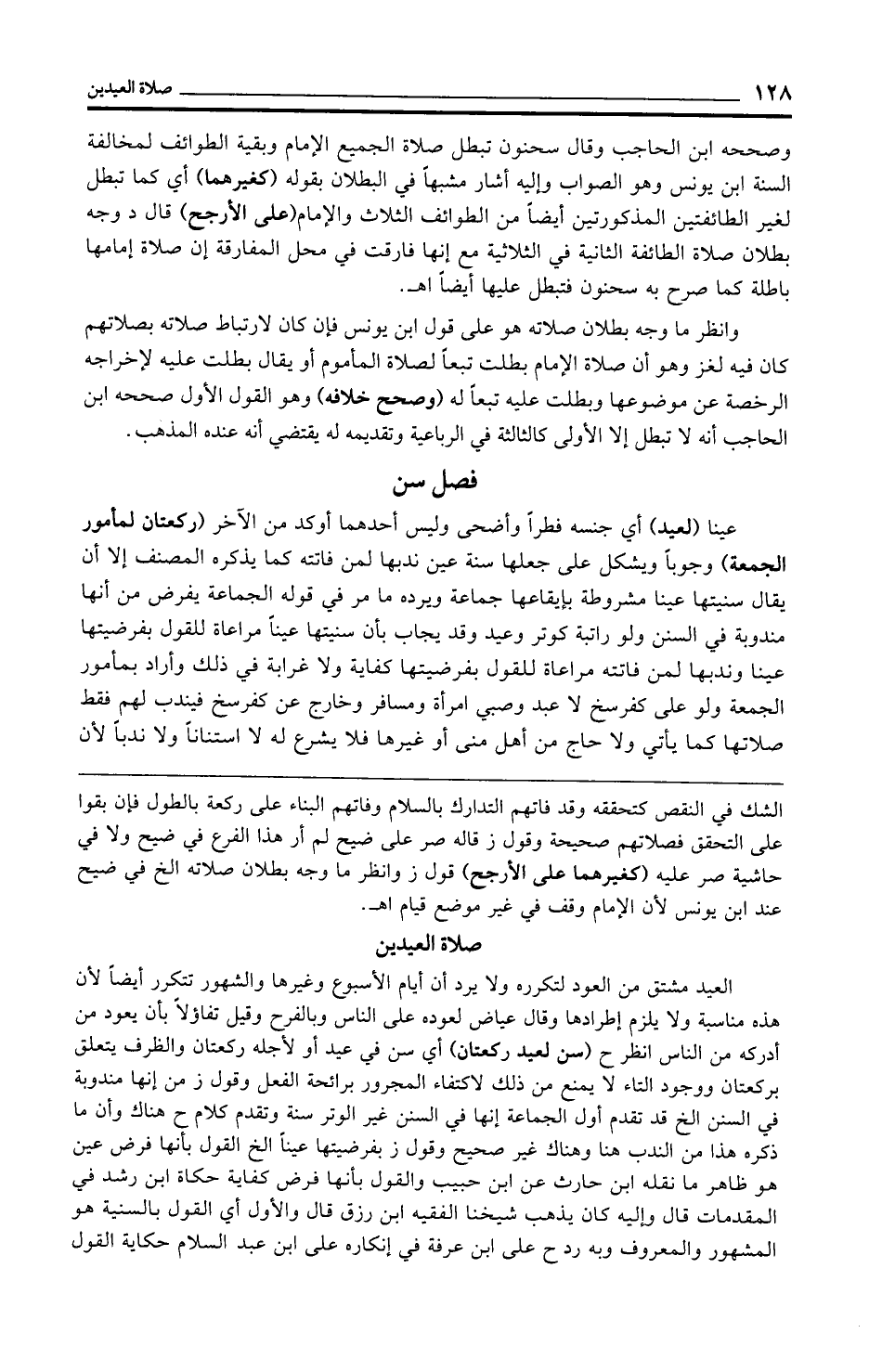 العيد مشتق من العود لتكرره ولا يرد أن أيام الأسبوع وغيرها والشهور تتكرر أيضًا لأن هذه مناسبة ولا يلزم إطرادها وقال عياض لعوده على الناس وبالفرح وقيل تفاؤلًا بأن يعود من أدركه من الناس انظر ح (سن لعيد ركعتان) أي سن في عيد أو لأجله ركعتان والظرف يتعلق بركعتان ووجود التاء لا يمنع من ذلك لاكتفاء المجرور برائحة الفعل وقول ز من إنها مندوبة في السنن الخ قد تقدم أول الجماعة إنها في السنن غير الوتر سنة وتقدم كلام ح هناك وأن ما ذكره هذا من الندب هنا وهناك غير صحيح وقول ز بفرضيتها عينًا الخ القول بأنها فرض عين هو ظاهر ما نقله ابن حارث عن ابن حبيب والقول بأنها فرض كفاية حكاه ابن رشد في المقدمات قال وإليه كان يذهب شيخنا الفقيه ابن رزق قال والأول أي القول بالسنية هو المشهور والمعروف وبه رد ح على ابن عرفة في إنكاره على ابن عبد السلام حكاية القول