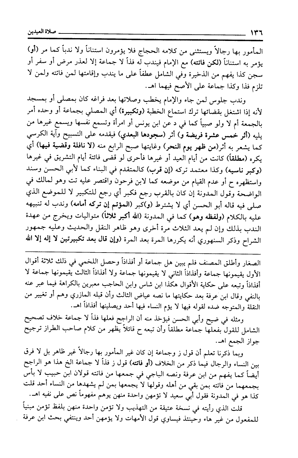 وندب جلوس لمن جاء والإمام يخطب وصلاتها بعد فراغه كان بمصلى أو بمسجد لأنه إذا اشتغل بقضائها ترك استماع الخطبة (وتكبيرة) أي المصلي بجماعة أو وحده أمر بالجمعة أم لا ولو صبيًّا كما في د عن ابن يونس أو امرأة وتسمع نفسها ويسمع غيرها من يليه (أثر خمس عشرة فريضة و) أثر (سجودها البعدي) فيقدمه على التسبيح وآية الكرسي كما يشعر به أثر (من ظهر يوم النحر) وغايتها صبح الرابع منه (لا نافلة وقضية فيها) أي يكره (مطلقًا) كانت من أيام العيد أو غيرها فأحرى لو قضى فائتة أيام التشريق في غيرها (وكبر ناسيه) وكذا معتمد تركه (إن قرب) كالمتقدم في البناء كما لأبي الحسن وسند واستظهره ح أو عدم القيام من موضعه كما لابن فرحون واقتصر عليه تت وهو لمالك في الواضحة وقول المدونة إن كان بالقرب رجع فكبر أي رجع للتكبير لا للموضع الذي صلى فيه قاله أبو الحسن أي لا يشترط (و) كبر (المؤتم إن تركه أمامه) وندب له تنبيهه عليه بالكلام (ولفظه وهو) كما في المدونة (الله أكبر ثلاثًا) متواليات ويخرج من عهدة الندب بذلك وإن لم يعد الثلاث مرة أخرى وهو ظاهر النقل والحديث وعليه جمهور الشراح وذكر السنهوري أنه يكررها المرة بعد المرة (وإن قال بعد تكبيرتين لا إله إلا الله