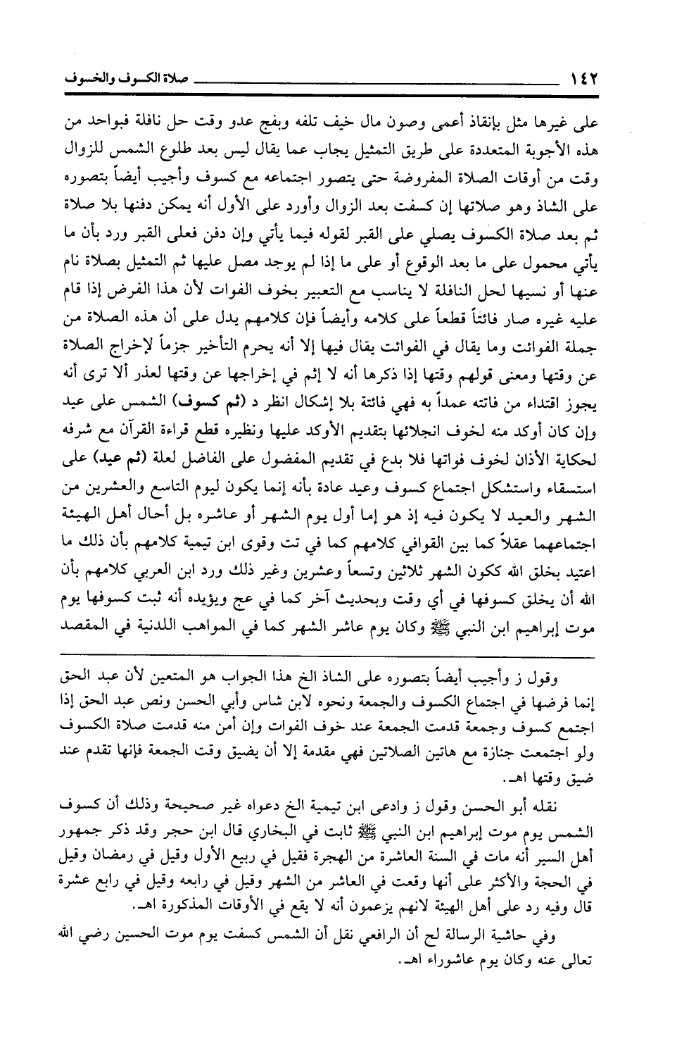 على غيرها مثل بإنقاذ أعمى وصون مال خيف تلفه وبفج عدو وقت حل نافلة فبواحد من هذه الأجوبة المتعددة على طريق التمثيل يجاب عما يقال ليس بعد طلوع الشمس للزوال وقت من أوقات الصلاة المفروضة حتى يتصور اجتماعه مع كسوف وأجيب أيضًا بتصوره على الشاذ وهو صلاتها إن كسفت بعد الزوال وأورد على الأول أنه يمكن دفنها بلا صلاة ثم بعد صلاة الكسوف يصلي على القبر لقوله فيما يأتي وإن دفن فعلى القبر ورد بأن ما يأتي محمول على ما بعد الوقوع أو على ما إذا لم يوجد فصل عليها ثم التمثيل بصلاة نام عنها أو نسيها لحل النافلة لا يناسب مع التعبير بخوف الفوات لأن هذا الفرض إذا قام عليه غيره صار فائتًا قطعًا على كلامه وأيضًا فإن كلامهم يدل على أن هذه الصلاة من جملة الفوائت وما يقال في الفوائت يقال فيها إلا أنه يحرم التأخير جزمًا لإخراج الصلاة عن وقتها ومعنى قولهم وقتها إذا ذكرها أنه لا إثم في إخراجها عن وقتها لعذر ألا ترى أنه يجوز اقتداء من فاتته عمدًا به فهي فائتة بلا إشكال انظر د (ثم كسوف) الشمس على عيد وإن كان أوكد منه لخوف انجلائها بتقديم الأوكد عليها ونظيره قطع قراءة القرآن مع شرفه لحكاية الأذان لخوف فواتها فلا بدع في تقديم المفضول على الفاضل لعلة (ثم عيد) على استسقاء واستشكل اجتماع كسوف وعيد عادة بأنه إنما يكون ليوم التاسع والعشرين من الشهر والعيد لا يكون فيه إذ هو إما أول يوم الشهر أو عاشره بل أحال أهل الهيئة اجتماعهما عقلًا كما بين القوافي كلامهم كما في تت وقوى ابن تيمية كلامهم بأن ذلك ما اعتيد بخلق الله يكون الشهر ثلاثين وتسعًا وعشرين وغير ذلك ورد ابن العربي كلامهم بأن الله أن يخلق كسوفها في أي وقت وبحديث آخر كما في عج ويؤيده أنه ثبت كسوفها يوم موت إبراهيم ابن النبي - صلى الله عليه وسلم - وكان يوم عاشر الشهر كما في المواهب اللدنية في المقصد
