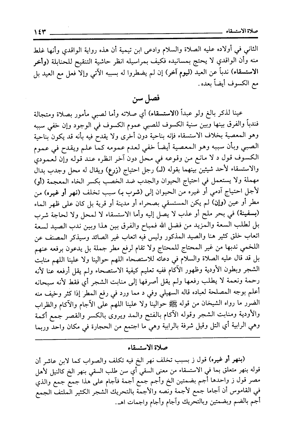 الثاني في أولاده عليه الصلاة والسلام وادعى ابن تيمية أن هذه رواية الواقدي وأنها غلط منه وأن الواقدي لا يحتج بمسانيده فكيف بمراسيله انظر حاشية التنقيح للحنابلة (وأخر الاستسقاء) ندبًا عن العيد (ليوم آخر) إن لم يضطروا له بسببه الآتي وإلا فعل مع العيد بل مع الكسوف أيضًا بعده.