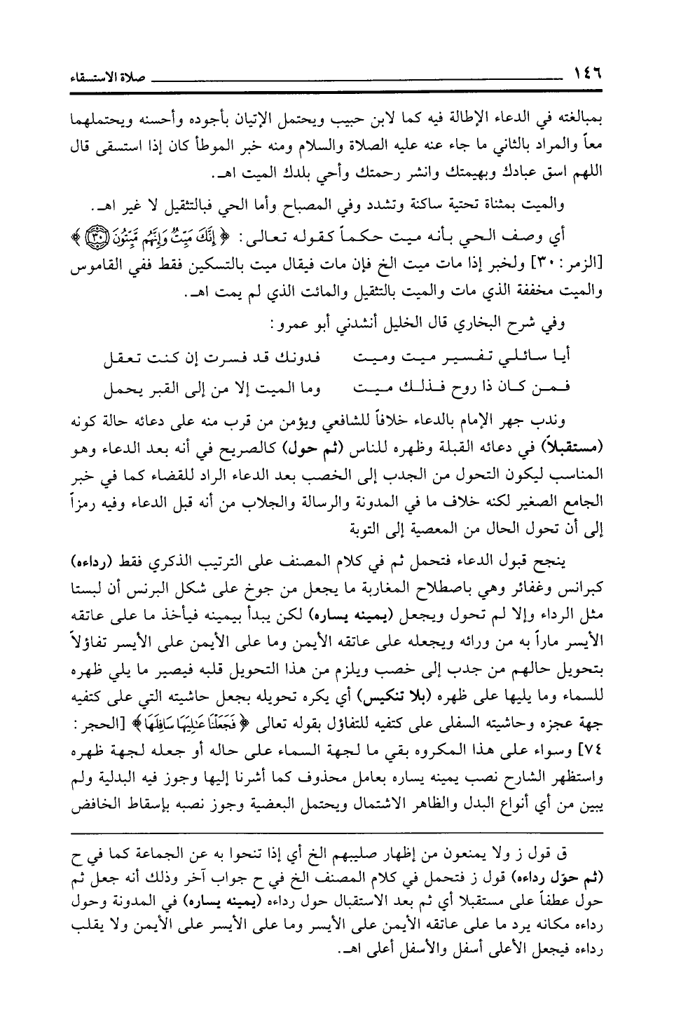 وندب جهر الإِمام بالدعاء خلافًا للشافعي ويؤمن من قرب منه على دعائه حالة كونه (مستقبلًا) في دعائه القبلة وظهره للناس (ثم حول) كالصريح في أنه بعد الدعاء وهو المناسب ليكون التحول من الجدب إلى الخصب بعد الدعاء الراد للقضاء كما في خبر الجامع الصغير لكنه خلاف ما في المدونة والرسالة والجلاب من أنه قبل الدعاء وفيه رمزًا إلى أن تحول الحال من المعصية إلى التوبة.