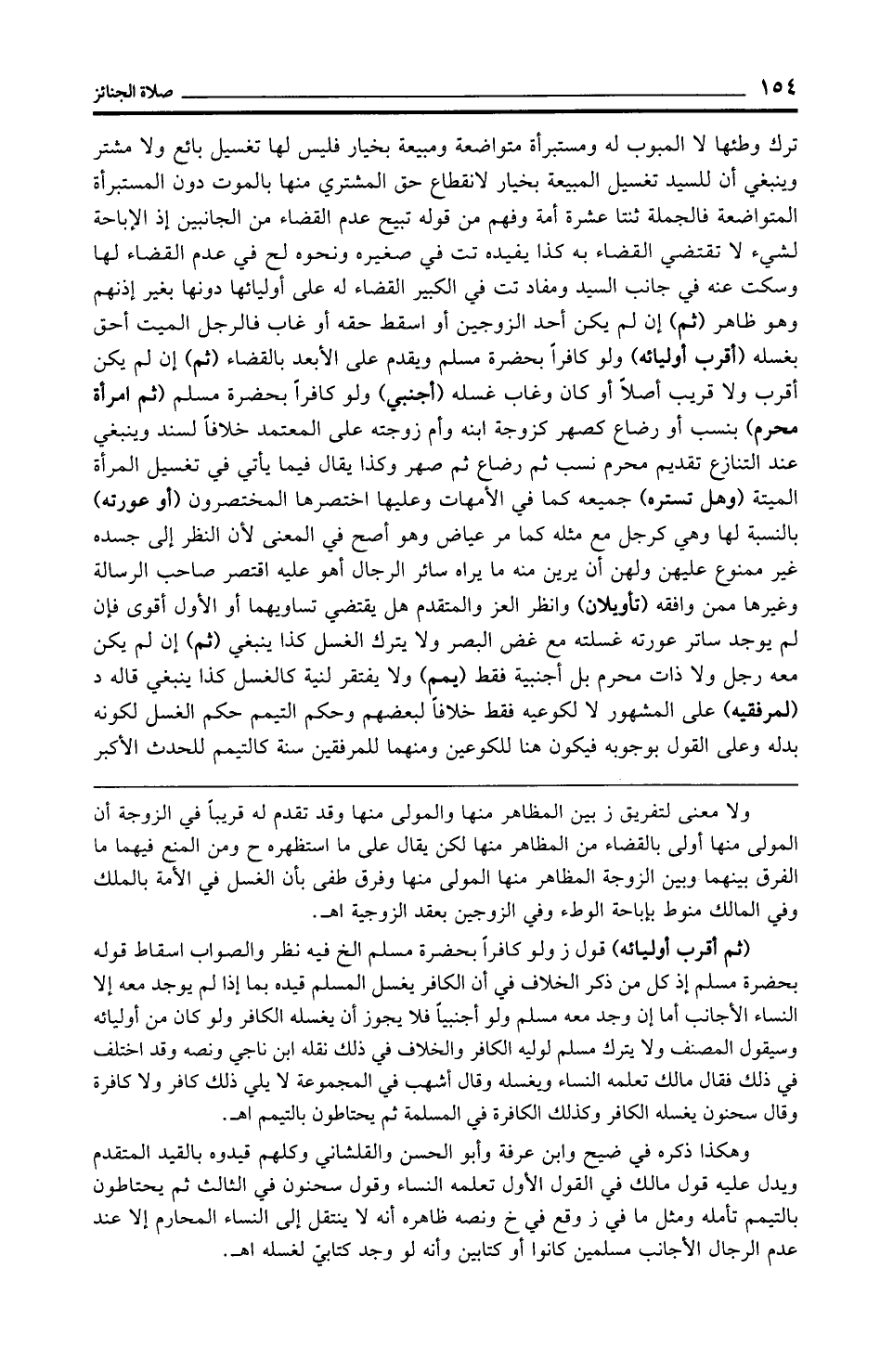 ترك وطئها لا المبوب له ومستبرأة متواضعة ومبيعة بخيار فليس لها تغسيل بائع ولا مشتر وينبغي أن للسيد تغسيل المبيعة بخيار لانقطاع حق المشتري منها بالموت دون المستبرأة المتواضعة فالجملة ثنتا عشرة أمة وفهم من قوله تبيح عدم القضاء من الجانبين إذ الإباحة لشيء لا تقتضي القضاء به كذا يفيده تت في صغيره ونحوه لح في عدم القضاء لها وسكت عنه في جانب السيد ومفاد تت في الكبير القضاء له على أوليائها دونها بغير إذنهم وهو ظاهر (ثم) إن لم يكن أحد الزوجين أو أسقط حقه أو غاب فالرجل الميت أحق بغسله (أقرب أوليائه) ولو كافرًا بحضرة مسلم ويقدم على الأبعد بالقضاء (ثم) إن لم يكن أقرب ولا قريب أصلًا أو كان وغاب غسله (أجنبي) ولو كافرًا بحضرة مسلم (ثم امرأة محرم) بنسب أو رضاع كصهر كزوجة ابنه وأم زوجته على المعتمد خلافًا بسند وينبغي عند التنازع تقديم محرم نسب ثم رضاع ثم صهر وكذا يقال فيما يأتي في تغسيل المرأة الميتة (وهل تستره) جميعه كما في الأمهات وعليها اختصرها المختصرون (أو عورته) بالنسبة لها وهي كرجل مع مثله كما مر عياض وهو أصح في المعنى لأن النظر إلى جسده غير ممنوع عليهن ولهن أن يرين منه ما يراه سائر الرجال أهو عليه اقتصر صاحب الرسالة وغيرها ممن وافقه (تأويلان) وانظر العز والمتقدم هل يقتضي تساويهما أو الأول أقوى فإن لم يوجد ساتر عورته غسلته مع غض البصر ولا يترك الغسل كذا ينبغي (ثم) إن لم يكن معه رجل ولا ذات محرم بل أجنبية فقط (يمم) ولا يفتقر لنية كالغسل كذا ينبغي قاله د (لمرفقيه) على المشهور لا لكوعيه فقط خلافًا لبعضهم وحكم التيمم حكم الغسل لكونه بدله وعلى القول بوجوبه فيكون هنا للكوعين ومنهما للمرفقين سنة كالتيمم للحديث الأكبر