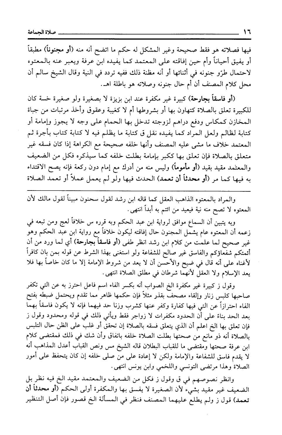 فيها فصلاته هو فقط صحيحة وغير المشكل له حكم ما اتضح أنه منه (أو مجنونًا) مطبقًا أو يفيق أحيانًا وأم حين إفاقته على المعتمد كما يفيده ابن عرفة ويعبر عنه بالمعتوه لاحتمال طرّو جنونه في أثنائها أو أنه مظنة ذلك ففيه تردد في النية وقال الشيخ سالم أن محل كلام المصنف أن أم حال جنونه وصلاته هو باطلة اهـ.