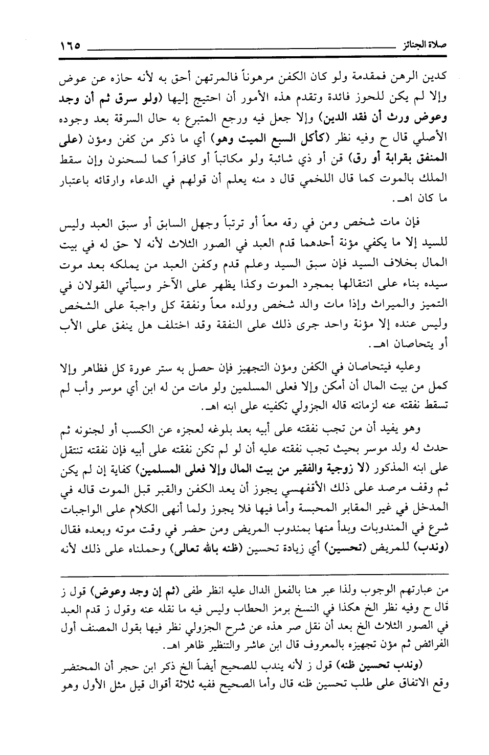 من عبارتهم الوجوب ولذا عبر هنا بالفعل الدال عليه انظر طفى (ثم إن وجد وعوض) قول ز قال ح وفيه نظر الخ هكذا في النسخ برمز الحطاب وليس فيه ما نقله عنه وقول ز قدم العبد في الصور الثلاث الخ بعد أن نقل صر هذه عن شرح الجزولي نظر فيها بقول المصنف أول الفرائض ثم مؤن تجهيزه بالمعروف قال ابن عاشر والتنظير ظاهر اهـ.