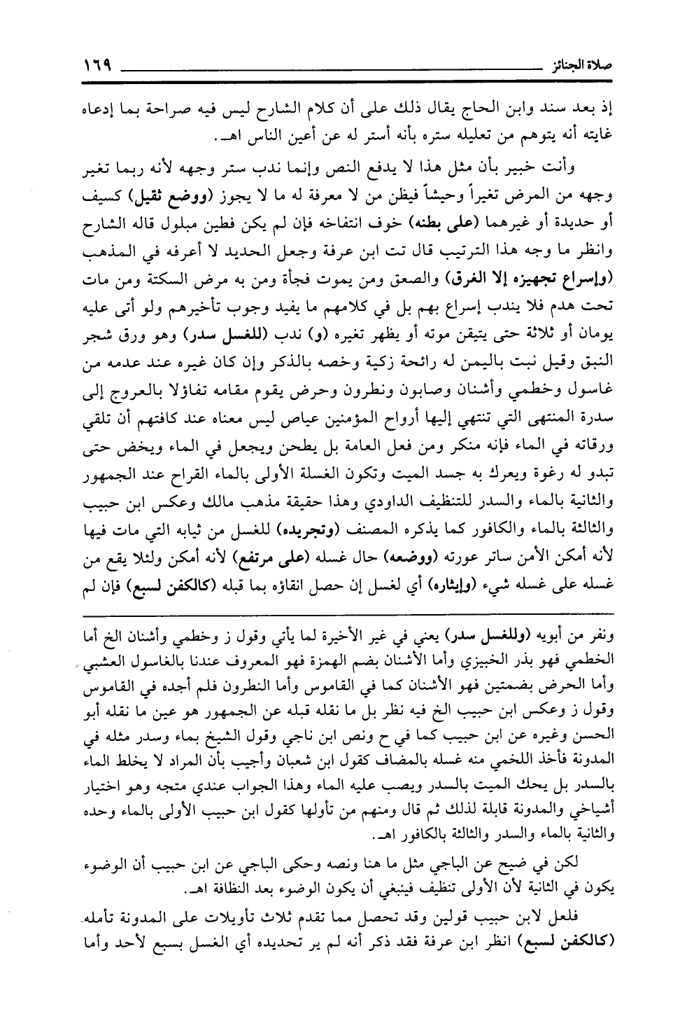 وأنت خبير بأن مثل هذا لا يدفع النص وإنما ندب ستر وجهه لأنه ربما تغير وجهه من المرض تغيرًا وحيشًا فيظن من لا معرفة له ما لا يجوز (ووضع ثقيل) كسيف أو حديدة أو غيرهما (على بطنه) خوف انتفاخه فإن لم يكن فطين مبلول قاله الشارح وانظر ما وجه هذا الترتيب قال تت ابن عرفة وجعل الحديد لا أعرفه في المذهب (وإسراع تجهيزه إلا الغرق) والصعق ومن يموت فجأة ومن به مرض السكتة ومن مات تحت هدم فلا يندب إسراع بهم بل في كلامهم ما يفيد وجوب تأخيرهم ولو أتى عليه يومان أو ثلاثة حتى يتيقن موته أو يظهر تغيره (و) ندب (للغسل سدر) وهو ورق شجر النبق وقيل نبت باليمن له رائحة زكية وخصه بالذكر وإن كان غيره عند عدمه من غاسول وخطمي وأشنان وصابون ونطرون وحرض يقوم مقامه تفاؤلا بالعروج إلى سدرة المنتهى التي تنتهي إليها أرواح المؤمنين عياص ليس معناه عند كافتهم أن تلقي ورقاته في الماء فإنه منكر ومن فعل العامة بل يطحن ويجعل في الماء ويخض حتى تبدو له رغوة ويعرك به جسد الميت وتكون الغسلة الأولى بالماء القراح عند الجمهور والثانية بالماء والسدر للتنظيف الداودي وهذا حقيقة مذهب مالك وعكس ابن حبيب والثالثة بالماء والكافور كما يذكره المصنف (وتجريده) للغسل من ثيابه التي مات فيها لأنه أمكن الأمن ساتر عورته (ووضعه) حال غسله (على مرتفع) لأنه أمكن ولئلا يقع من غسله على غسله شيء (وإيثاره) أي لغسل إن حصل إنقاؤه بما قبله (كالكفن لسبع) فإن لم