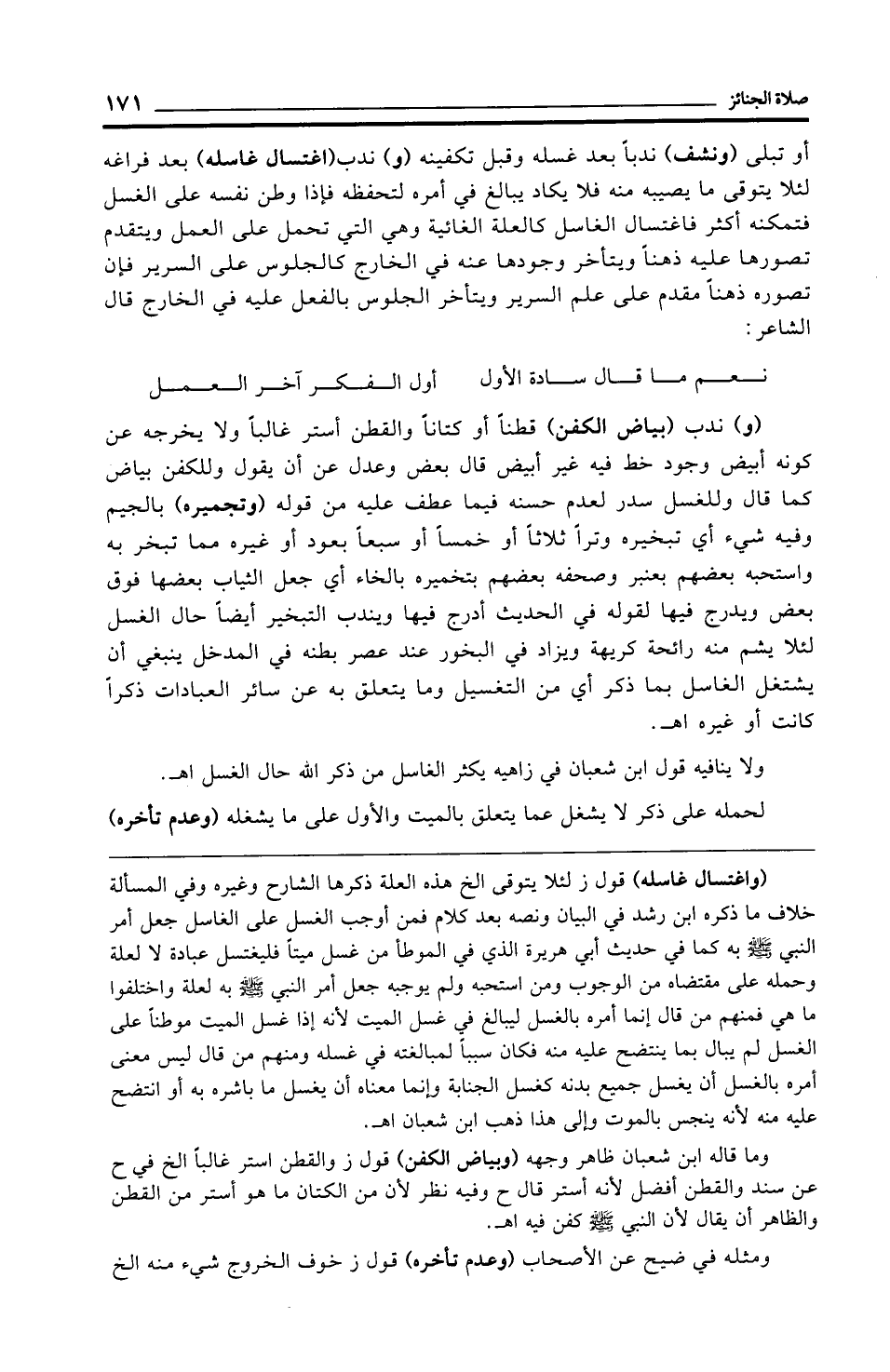 أو تبلى (ونشف) ندبًا بعد غسله وقبل تكفينه (و) ندب (اغتسال غاسله) بعد فراغه لئلا يتوقى ما يصيبه منه فلا يكاد يبالغ في أمره لتحفظه فإذا وطن نفسه على الغسل فتمكنه أكثر فاغتسال الغاسل كالعلة الغائية وهي التي تحمل على العمل ويتقدم تصورها عليه ذهنًا ويتأخر وجودها عنه في الخارج كالجلوس على السرير فإن تصوره ذهنًا مقدم على علم السرير ويتأخر الجلوس بالفعل عليه في الخارج قال الشاعر:
