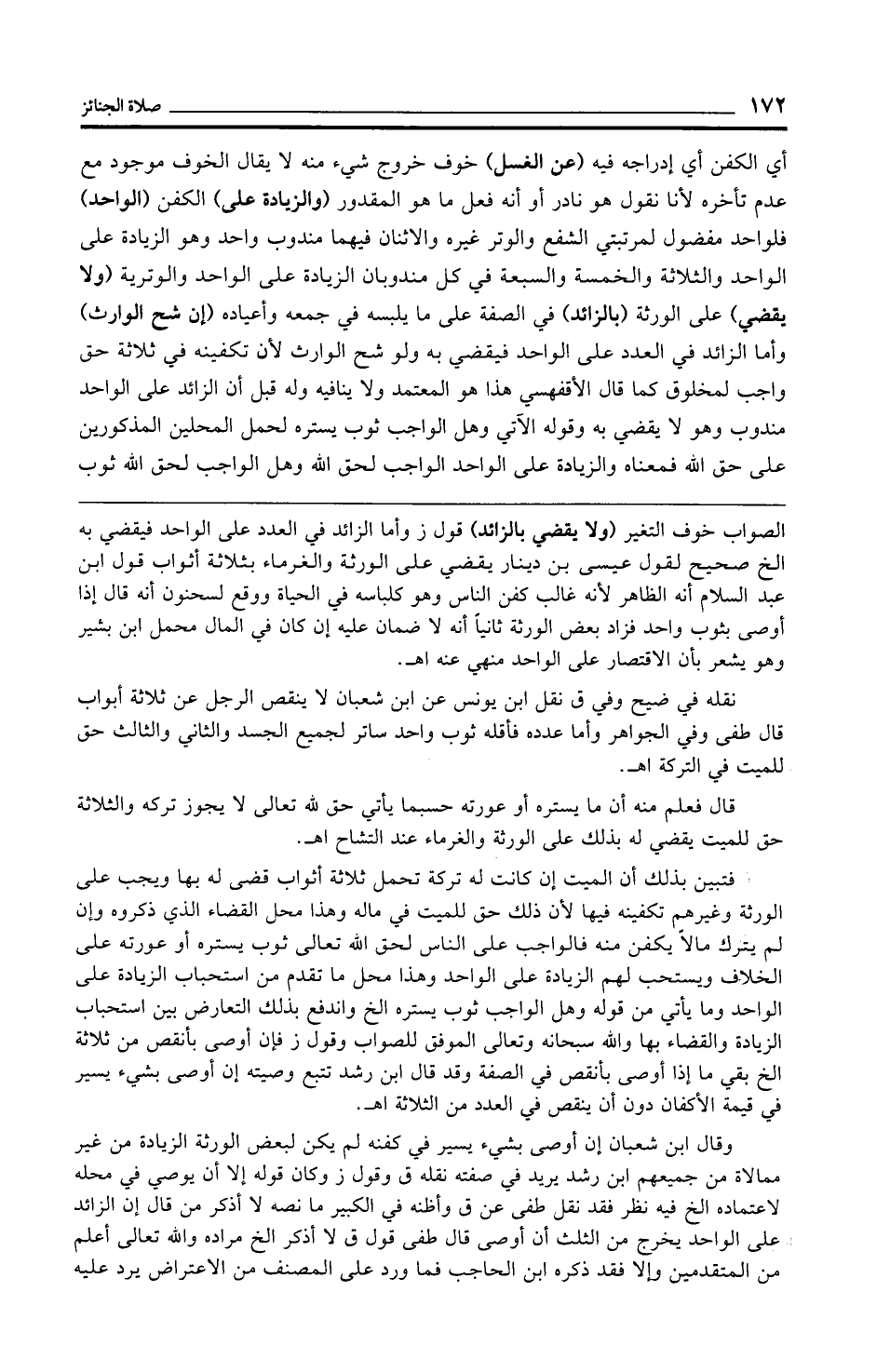 الصواب خوف التغير (ولا يقضي بالزائد) قول ز وأما الزائد في العدد على الواحد فيقضي به الخ صحيح لقول عيسى بن دينار يقضي على الورثة والغرماء بثلاثة أثواب قول ابن عبد السلام أنه الظاهر لأنه غالب كفن الناس وهو كلباسه في الحياة ووقع لسحنون أنه قال إذا أوصى بثوب واحد فزاد بعض الورثة ثانيًا أنه لا ضمان عليه إن كان في المال محمل ابن بشير وهو يشعر بأن الاقتصار على الواحد منهي عنه اهـ.