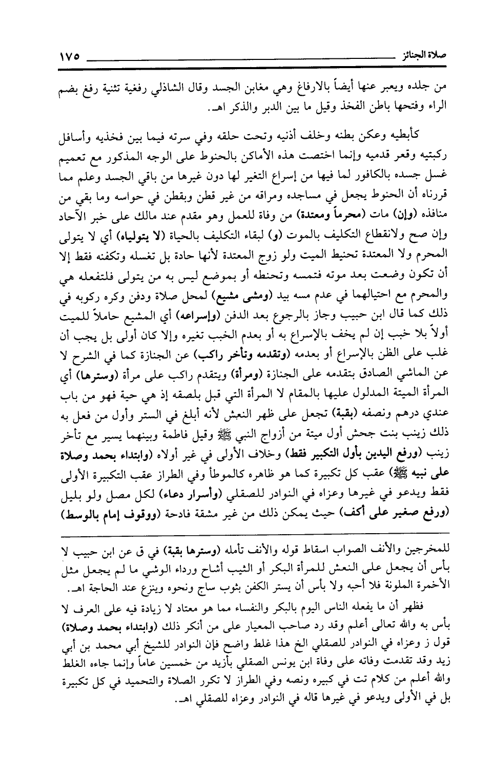 كأبطيه وعكن بطنه وخلف أذنيه وتحت حلقه وفي سرته فيما بين فخذيه وأسافل ركبتيه وقعر قدميه وإنما اختصت هذه الأماكن بالحنوط على الوجه المذكور مع تعميم غسل جسده بالكافور لما فيها من إسراع التغير لها دون غيرها من باقي الجسد وعلم مما قررناه أن الحنوط يجعل في مساجده ومراقه من غير قطن وبقطن في حواسه وما بقي من منافذه (وإن) مات (محرمًا ومعتدة) من وفاة للعمل وهو مقدم عند مالك على خبر الآحاد وإن صح ولانقطاع التكليف بالموت (و) لبقاء التكليف بالحياة (لا يتولياه) أي لا يتولى المحرم ولا المعتدة تحنيط الميت ولو زوج المعتدة لأنها حادة بل تغسله وتكفنه فقط إلا أن تكون وضعت بعد موته فتمسه وتحنطه أو بموضع ليس به من يتولى فلتفعله هي والمحرم مع احتيالهما في عدم مسه بيد (ومشى مشيع) لمحل صلاة ودفن وكره ركوبه في ذلك كما قال ابن حبيب وجاز بالرجوع بعد الدفن (وإسراعه) أي المشيع حاملًا للميت أولًا بلا خبب إن لم يخف بالإسراع به أو بعدم الخبب تغيره وإلا كان أولى بل يجب أن غلب على الظن بالإسراع أو بعدمه (وتقدمه وتأخر راكب) عن الجنازة كما في الشرح لا عن الماشي الصادق بتقدمه على الجنازة (ومرأة) ويتقدم راكب على مرأة (وسترها) أي المرأة الميتة المدلول عليها بالمقام لا المرأة التي قبل بلصقه إذ هي حية فهو من باب عندي درهم ونصفه (بقبة) تجعل على ظهر النبش لأنه أبلغ في الستر وأول من فعل به ذلك زينب بنت جحش أول ميتة من أزواج النبي - صلى الله عليه وسلم - وقيل فاطمة وبينهما يسير مع تأخر زينب (ورفع اليدين بأول التكبير فقط) وخلاف الأولى في غير أولاه (وابتداء بحمد وصلاة على نبيه - صلى الله عليه وسلم -) عقب كل تكبيرة كما هو ظاهره كالموطأ وفي الطراز عقب التكبيرة الأولى فقط ويدعو في غيرها وعزاه في النوادر للصقلي (وأسرار دعاء) لكل مصل ولو بليل (ورفع صغير على أكف) حيث يمكن ذلك من غير مشقة فادحة (ووقوف إمام بالوسط)