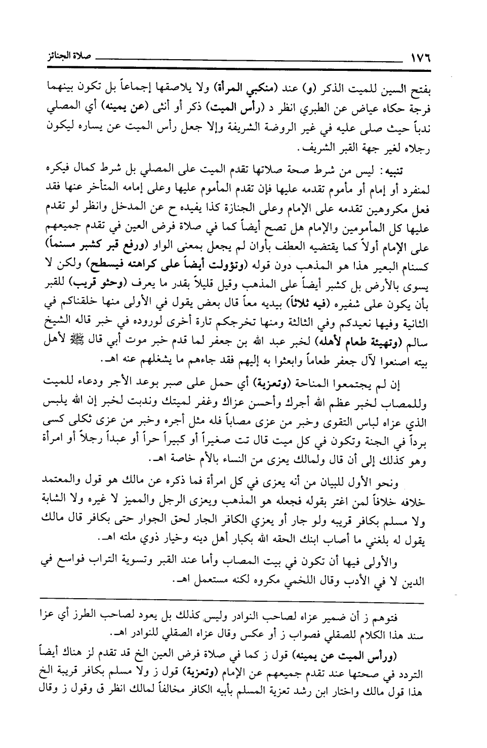 (ورأس الميت عن يمينه) قول ز كما في صلاة فرض العين الخ قد تقدم لز هناك أيضًا التردد في صحتها عند تقدم جميعهم عن الإِمام (وتعزية) قول ز ولا مسلم بكافر قريبة الخ هذا قول مالك واختار ابن رشد تعزية المسلم بأبيه الكافر مخالفًا لمالك انظر ق وقول ز وقال