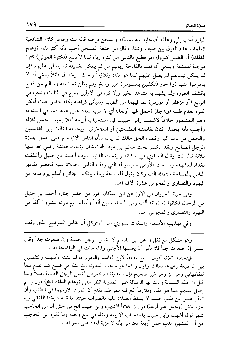 البارد أحب إلي وعلله أصحابه بأنه يمسكه والسخن يرخيه قاله تت وظاهر كلام الشافعية كعلمائنا عدم الفرق بين صيف وشتاء وقال أبو حنيفة المسخن أحب لأنه أكثر نقاء (وعدم الدلك) أو الغسل كنزول أمر فظيع بالناس من كثرة وباء كما لأصبغ (لكثرة الموتى) كثرة موجبة للمشقة وينبغي أن تقيد بالفادحة ويميم من لم يمكن تغسيله ثم يصلي عليهم فإن لم يمكن تيممهم لم يصل عليهم كما هو مفاد وتلازمًا وبحث شيخنا ق قائلًا ينبغي أن لا يحرموا منها (و) جاز (تكفين بملبوس) غير وسخ ولم يظن نجاسته وسالم من قطع يكشف العورة ولم يشهد به مشاهد الخير وإلا كره في الأولين ومنع في الثالث وندب في الرابع (أو مزعفر أو مورس) لما فيهما من الطيب وسيأتي كراهته بكاء خضر حيث أمكن غيره لعدم طيبه (و) جاز (حمل غير أربعة) أي لا مزية لعدد على عدد كما في المدونة وهو المشهور خلافًا لأشهب وابن حبيب في استحباب أربعة لئلا يميل بحمل ثلاثة وأجيب بأنه يحمله اثنان بقائمتيه المقدمتين أو المؤخرتين ويحمله الثالث بين القائمتين والحمل من باب البر وقضاء الحق مالك لم يزل شأن الناس الازدحام على حمل جنازة الرجل الصالح ولقد انكسر تحت سالم بن عبد الله نعشان وتحت عائشة رضي الله عنها ثلاثة قاله تت وقال المناوي في طبقاته وارتجت الدنيا لموت أحمد بن حنبل وأغلقت بغداد لمشهده ومسحت الأرض المبسوطة التي وقف الناس للصلاة عليه فحصر مقادير الناس بالمساحة ستمائة ألف وكان يقول للمبتدعة بيننا وبينكم الجنائز وأسلم يوم موته من اليهود والنصارى والمجوس عشرة آلاف اهـ.