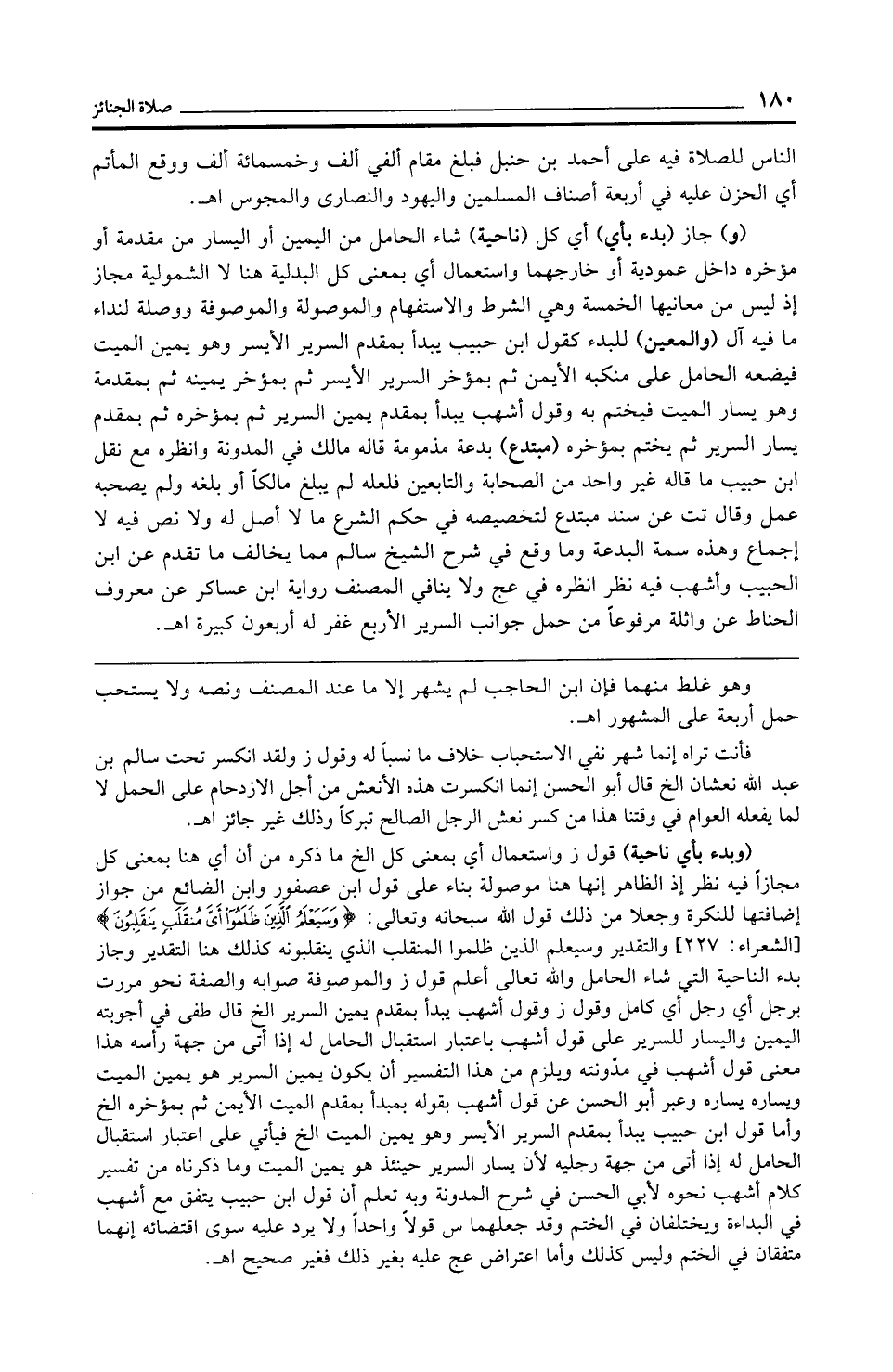 (وبدء بأي ناحية) قول ز واستعمال أي بمعنى كل الخ ما ذكره من أن أي هنا بمعنى كل مجازًا فيه نظر إذ الظاهر إنها هنا موصولة بناء على قول ابن عصفور وابن الضائع من جواز إضافتها للنكرة وجعلا من ذلك قول الله سبحانه وتعالى: {وَسَيَعْلَمُ الَّذِينَ ظَلَمُوا أَيَّ مُنْقَلَبٍ يَنْقَلِبُونَ} [الشعراء: 227] والتقدير وسيعلم الذين ظلموا المنقلب الذي ينقلبونه كذلك هنا التقدير وجاز بدء الناحية التي شاء الحامل والله تعالى أعلم قول ز والموصوفة صوابه والصفة نحو مررت برجل أي رجل أي كامل وقول ز وقول أشهب يبدأ بمقدم يمين السرير الخ قال طفى في أجوبته اليمين واليسار للسرير على قول أشهب باعتبار استقبال الحامل له إذا أتى من جهة رأسه هذا معنى قول أشهب في مدونته ويلزم من هذا التفسير أن يكون يمين السرير هو يمين الميت ويساره يساره وعبر أبو الحسن عن قول أشهب بقوله بمبدأ بمقدم الميت الأيمن ثم بمؤخره الخ وأما قول ابن حبيب يبدأ بمقدم السرير الأيسر وهو يمين الميت الخ فيأتي على اعتبار استقبال الحامل له إذا أتى من جهة رجليه لأن يسار السرير حينئذ هو يمين الميت وما ذكرناه من تفسير كلام أشهب نحوه لأبي الحسن في شرح المدونة وبه تعلم أن قول ابن حبيب يتفق مع أشهب في البداءة ويختلفان في الختم وقد جعلهما س قولًا واحدًا ولا يرد عليه سوى اقتضائه إنهما متفقان في الختم وليس كذلك وأما اعتراض عج عليه بغير ذلك فغير صحيح اهـ.