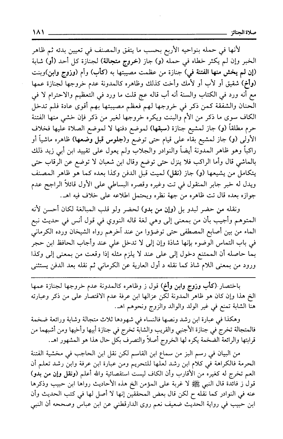 باختصار (كأب وزوج وابن وأخ) قول ز وظاهره كالمدونة عدم خروجها لجنازة عمها الخ هذا وإن كان هو ظاهر المدونة لكن عزالها ابن عرفة عدم الاقتصار على من ذكر وعبارته هنا الشابة تمنع في غير الولد والوالد والزوج ونحوهم اهـ.