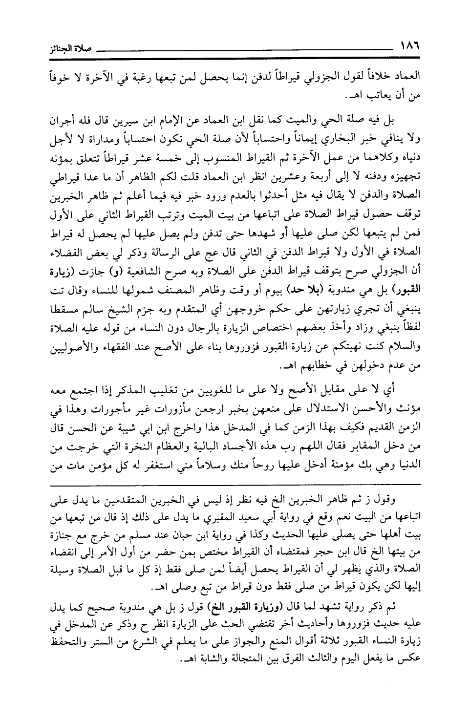 بل فيه صلة الحي والميت كما نقل ابن العماد عن الإِمام ابن سيرين قال فله أجران ولا ينافي خبر البخاري إيمانًا واحتسابًا لأن صلة الحي تكون احتسابًا ومداراة لا لأجل دنياه وكلاهما من عمل الآخرة ثم القيراط المنسوب إلى خمسة عشر قيراطًا تتعلق بمؤنه تجهيزه ودفنه لا إلى أربعة وعشرين انظر ابن العماد قلت لكم الظاهر أن ما عدا قيراطي الصلاة والدفن لا يقال فيه مثل أحدثوا بالعلم ورود خبر فيه فيما أعلم ثم ظاهر الخبرين توقف حصول قيراط الصلاة على اتباعها من بيت الميت وترتب القيراط الثاني على الأول فمن لم يتبعها لكن صلى عليها أو شهدها حتى تدفن ولم يصل عليها لم يحصل له قيراط الصلاة في الأول ولا قيراط الدفن في الثاني قال عج على الرسالة وذكر لي بعض الفضلاء أن الجزولي صرح بتوقف قيراط الدفن على الصلاة وبه صرح الشافعية (و) جازت (زيارة القبور) بل هي مندوبة (بلا حد) بيوم أو وقت وظاهر المصنف شمولها للنساء وقال تت ينبغي أن تجري زيارتهن على حكم خروجهن أي المتقدم وبه جزم الشيخ سالم مسقطا لفظًا ينبغي وزاد وأخذ بعضهم اختصاص الزيارة بالرجال دون النساء من قوله عليه الصلاة والسلام كنت نهيتكم عن زيارة القبور فزوروها بناء على الأصح عند الفقهاء والأصوليين من عدم دخولهن في خطابهم اهـ.