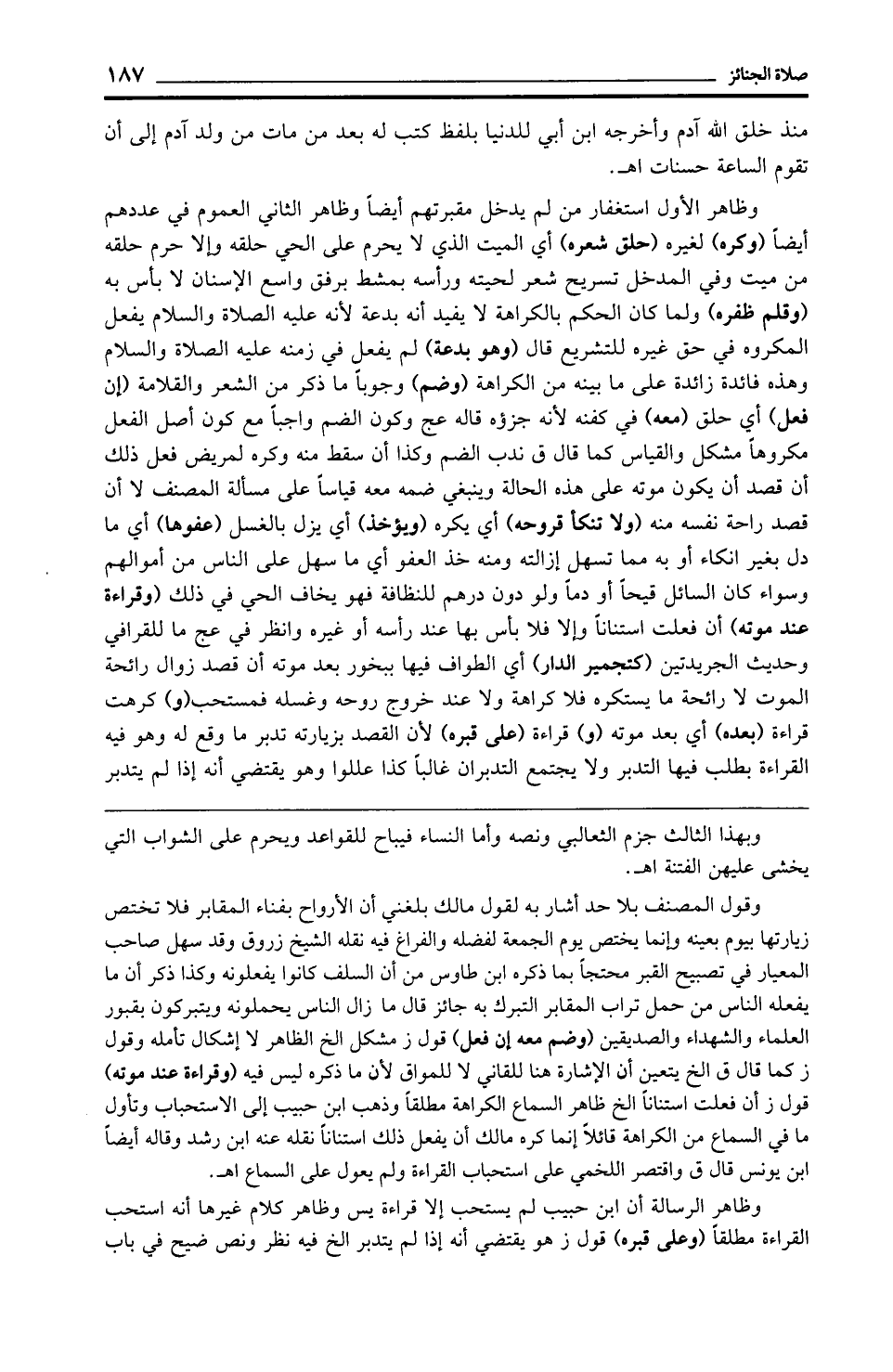 وظاهر الأول استغفار من لم يدخل مقبرتهم أيضًا وظاهر الثاني العموم في عددهم أيضًا (وكره) لغيره (حلق شعره) أي الميت الذي لا يحرم على الحي حلقه وإلا حرم حلقه من ميت وفي المدخل تسريح شعر لحيته ورأسه بمشط برفق واسع الأسنان لا بأس به (وقلم ظفره) ولما كان الحكم بالكراهة لا يفيد أنه بدعة لأنه عليه الصلاة والسلام يفعل المكروه في حق غيره للتشريع قال (وهو بدعة) لم يفعل في زمنه عليه الصلاة والسلام وهذه فائدة زائدة على ما بينه من الكراهة (وضم) وجوبًا ما ذكر من الشعر والقلامة (وإن فعل) أي حلق (معه) في كفنه لأنه جزؤه قاله عج وكون الضم واجبًا مع كون أصل الفعل مكروهًا مشكل والقياس كما قال في ندب الضم وكذا أن سقط منه وكره لمريض فعل ذلك أن قصد أن يكون موته على هذه الحالة وينبغي ضمه معه قياسًا على مسألة المصنف لا أن قصد راحة نفسه منه (ولا تنكأ قروحه) أي يكره (ويؤخذ) أي يزل بالغسل (عفوها) أي ما دل بغير انكاء أو به مما تسهل إزالته ومنه خذ العفو أي ما سهل على الناس من أموالهم وسواء كان السائل قيحًا أو دمًا ولو دون درهم للنظافة فهو يخاف الحي في ذلك (وقراءة عند موته) أن فعلت استنانًا وإلا فلا بأس بها عند رأسه أو غيره وانظر في عج ما للقرافي وحديث الجريدتين (كتجمير الدار) أي الطواف فيها ببخور بعد موته أن قصد زوال رائحة الموت لا رائحة ما يستكره فلا كراهة ولا عند خروج روحه وغسله فمستحب (و) كرهت قراءة (بعده) أي بعد موته (و) قراءة (على قبره) لأن القصد بزيارته تدبر ما وقع له وهو فيه القراءة بطلب فيها التدبر ولا يجتمع التدبران غالبًا كذا عللوا وهو يقتضي أنه إذا لم يتدبر