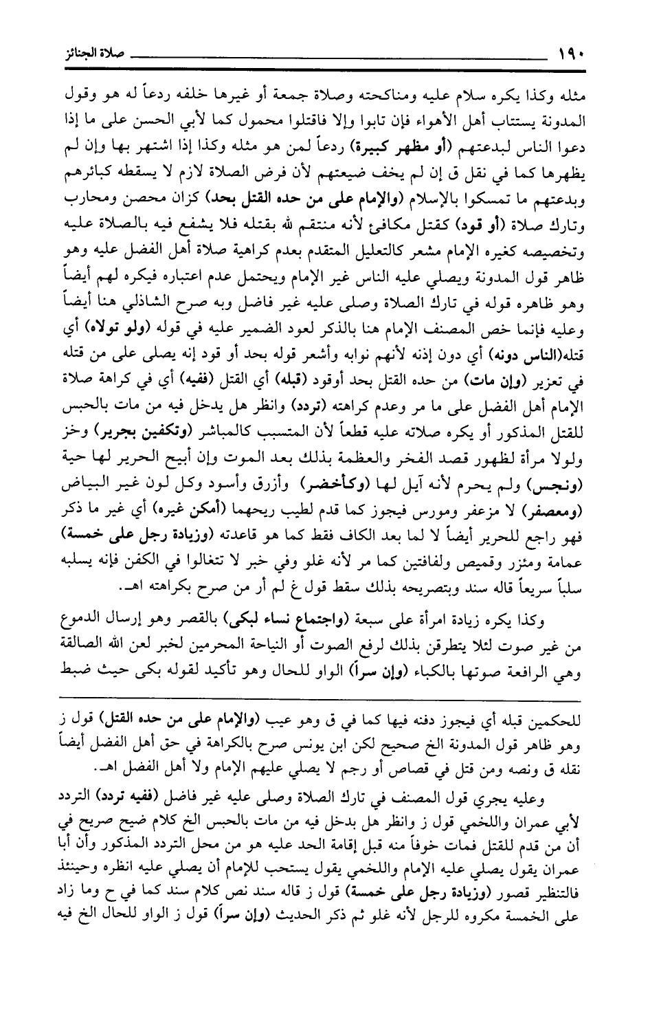 مثله وكذا يكره سلام عليه ومناكحته وصلاة جمعة أو غيرها خلفه ردعًا له هو وقول المدونة يستتاب أهل الأهواء فإن تابوا وإلا فاقتلوا محمول كما لأبي الحسن على ما إذا دعوا الناس لبدعتهم (أو مظهر كبيرة) ردعًا لمن هو مثله وكذا إذا اشتهر بها وإن لم يظهرها كما في نقل ق إن لم يخف ضيعتهم لأن فرض الصلاة لازم لا يسقطه كبائرهم وبدعتهم ما تمسكوا بالإِسلام (والإمام على من حده القتل بحد) كزان محصن ومحارب وتارك صلاة (أو قود) كقتل مكافئ لأنه منتقم لله بقتله فلا يشفع فيه بالصلاة عليه وتخصيصه كغيره الإِمام مشعر كالتعليل المتقدم بعدم كراهية صلاة أهل الفضل عليه وهو ظاهر قول المدونة ويصلي عليه الناس غير الإِمام ويحتمل عدم اعتباره فيكره لهم أيضًا وهو ظاهره قوله في تارك الصلاة وصلى عليه غير فاضل وبه صرح الشاذلي هنا أيضًا وعليه فإنما خص المصنف الإِمام هنا بالذكر لعود الضمير عليه في قوله (ولو تولاه) أي قتله (الناس دونه) أي دون إذنه لأنهم نوابه وأشعر قوله بحد أو قود إنه يصلى على من قتله في تعزير (وإن مات) من حده القتل بحد أو قود (قبله) أي القتل (ففيه) أي في كراهة صلاة الإِمام أهل الفضل على ما مر وعدم كراهته (تردد) وانظر هل يدخل فيه من مات بالحبس للقتل المذكور أو يكره صلاته عليه قطعًا لأن المتسبب كالمباشر (وتكفين بجرير) وخز ولولا مرأة لظهور قصد الفخر والعظمة بذلك بعد الموت وإن أبيح الحرير لها حية (ونجس) ولم يحرم لأنه آيل لها (وكأخضر) وأزرق وأسود وكل لون غير البياض (ومعصفر) لا مزعفر ومورس فيجوز كما قدم لطيب ريحهما (أمكن غيره) أي غير ما ذكر فهو راجع للحرير أيضًا لا لما بعد الكاف فقط كما هو قاعدته (وزيادة رجل على خمسة) عمامة ومئزر وقميص ولفافتين كما مر لأنه غلو وفي خبر لا تتغالوا في الكفن فإنه يسلبه سلبًا سريعًا قاله سند وبتصريحه بذلك سقط قول غ لم أر من صرح بكراهته اهـ.