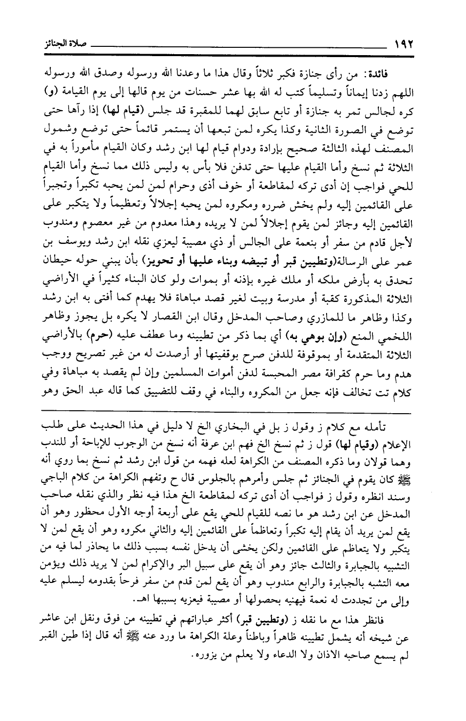 فائدة: من رأى جنازة فكبر ثلاثًا وقال هذا ما وعدنا الله ورسوله وصدق الله ورسوله اللهم زدنا إيمانًا وتسليمًا كتب له الله بها عشر حسنات من يوم قالها إلى يوم القيامة (و) كره لجالس تمر به جنازة أو تابع سابق لهما للمقبرة قد جلس (قيام لها) إذا رآها حتى توضع في الصورة الثانية وكذا يكره لمن تبعها أن يستمر قائمًا حتى توضع وشمول المصنف لهذه الثالثة صحيح بإرادة ودوام قيام لها ابن رشد وكان القيام مأمورًا به في الثلاثة ثم نسخ وأما القيام عليها حتى تدفن فلا بأس به وليس ذلك مما نسخ وأما القيام للحي فواجب إن أدى تركه لمقاطعة أو خوف أذى وحرام لمن لمن يحبه تكبرًا وتجبرًا على القائمين إليه ولم يخش ضرره ومكروه لمن يحبه إجلالًا وتعظيمًا ولا يتكبر على القائمين إليه وجائز لمن يقوم إجلالًا لمن لا يريده وهذا معدوم من غير معصوم ومندوب لأجل قادم من سفر أو بنعمة على المجالس أو ذي مصيبة ليعزي نقله ابن رشد ويوسف بن عمر على الرسالة (وتطيين قبر أو تبييضه وبناء عليها أو تحويز) بأن يبني حوله حيطان تحدق به بأرض ملكه أو ملك غيره بإذنه أو بموات ولو كان البناء كثيرًا في الأراضي الثلاثة المذكورة كقبة أو مدرسة وبيت لغير قصد مباهاة فلا يهدم كما أفتى به ابن رشد وكذا وظاهر ما للمازري وصاحب المدخل وقال ابن القصار لا يكره بل يجوز وظاهر اللخمي المنع (وإن بوهي به) أي بما ذكر من تطيينه وما عطف عليه (حرم) بالأراضي الثلاثة المتقدمة أو بموقوفة للدفن صرح بوقفيتها أو أرصدت له من غير تصريح ووجب هدم وما حرم كقرافة مصر المحبسة لدفن أموات المسلمين وإن لم يقصد به مباهاة وفي كلام تت تخالف فإنه جعل من المكروه والبناء في وقف للتضييق كما قاله عبد الحق وهو