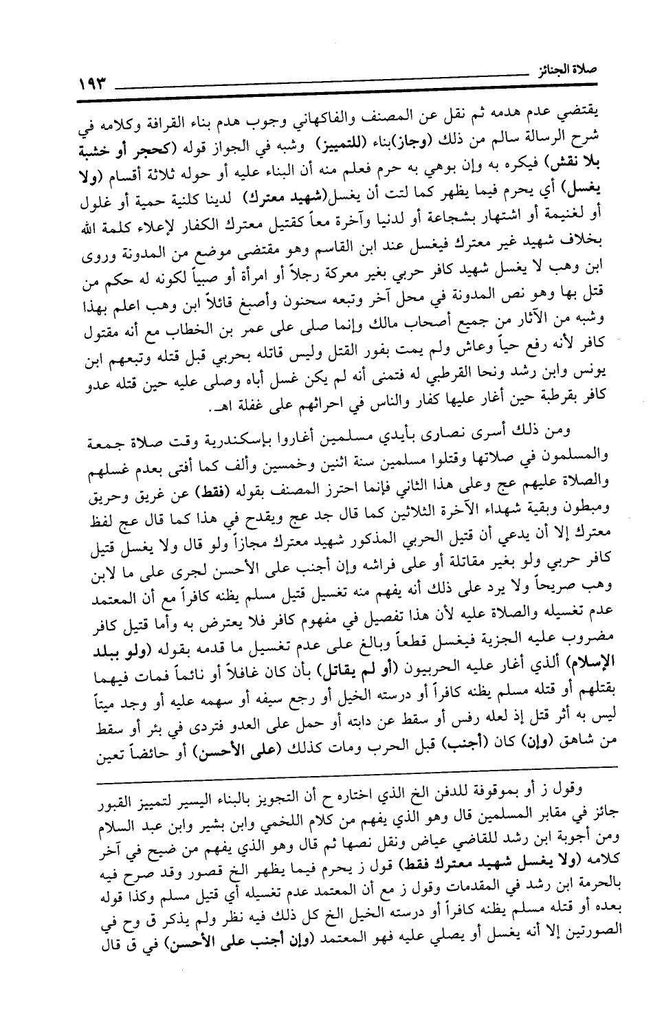 وقول ز أو بموقوفة للدفن الخ الذي اختاره ح أن التجويز بالبناء اليسير لتمييز القبور جائز في مقابر المسلمين قال وهو الذي يفهم من كلام اللخمي وابن بشير وابن عبد السلام ومن أجوبة ابن رشد للقاضي عياض ونقل نصها ثم قال وهو الذي يفهم من ضيح في آخر كلامه (ولا يغسل شهيد معترك فقط) قول ز يحرم فيما طهر الخ قصور وقد صرح فيه بالحرمة ابن رشد في المقدمات وقول ز مع أن المعتمد عدم تغسيله أي قتيل مسلم وكذا قوله بعده أو قتله مسلم يظنه كافرًا أو درسته الخيل الخ كل ذلك فيه نظر ولم يذكر ق وح في الصورتين إلا أنه يغسل أو يصلي عليه فهو المعتمد (وإن أجنب على الأحسن) في ق قال