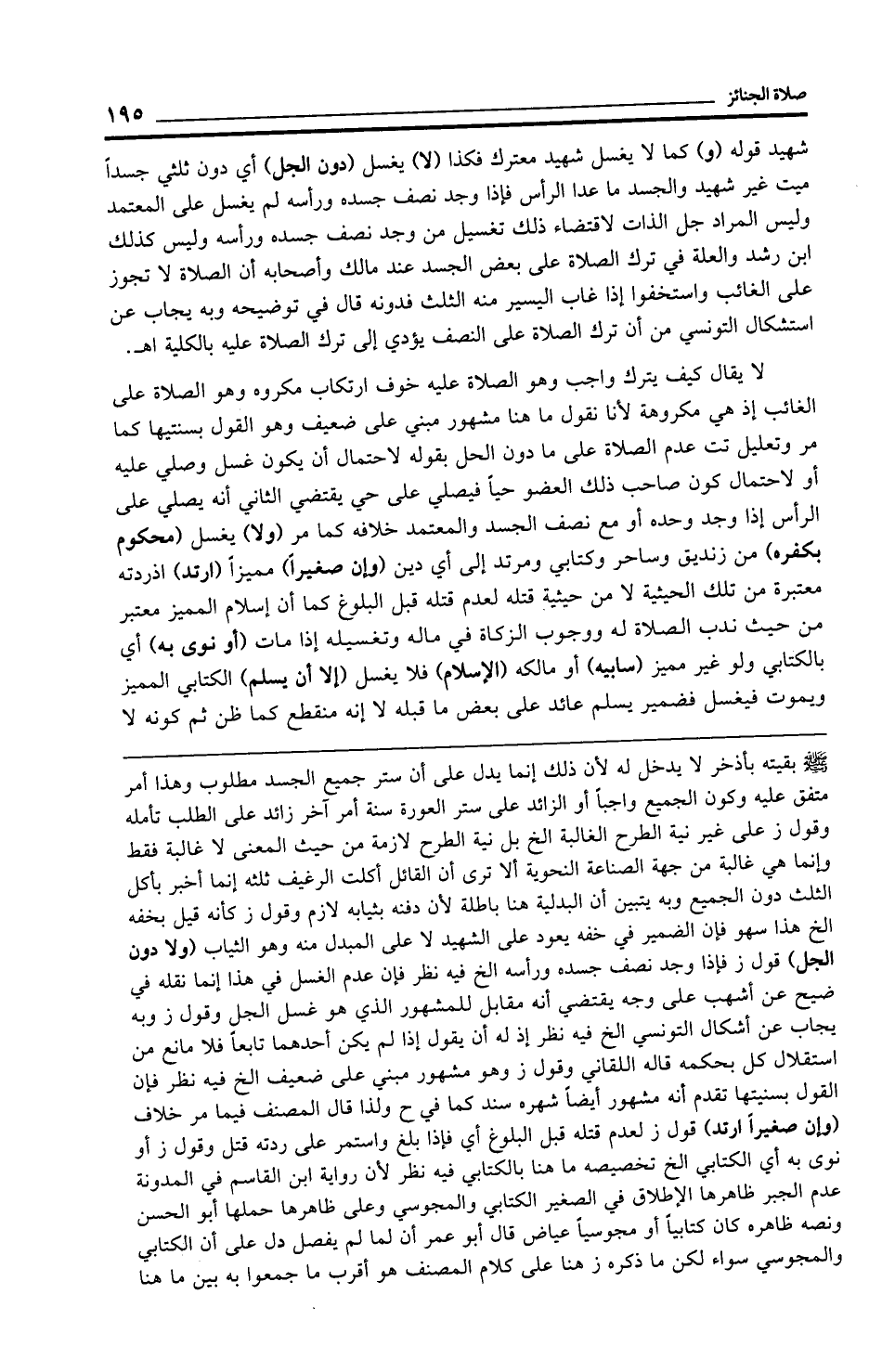 شهيد قوله (و) كما لا يغسل شهيد معترك فكذا (لا) يغسل (دون الجل) أي دون ثلثي جسدًا ميت غير شهيد والجسد ما عدا الرأس فإذا وجد نصف جسده ورأسه لم يغسل على المعتمد وليس المراد جل الذات لاقتضاء ذلك تغسيل من وجد نصف جسده ورأسه وليس كذلك ابن رشد والعلة في ترك الصلاة على بعض الجسد عند مالك وأصحابه أن الصلاة لا تجوز على الغائب واستخفوا إذا غاب اليسير منه الثلث فدونه قال في توضيحه وبه يجاب عن استشكال التونسي من أن ترك الصلاة على النصف يؤدي إلى ترك الصلاة عليه بالكلية اهـ.
