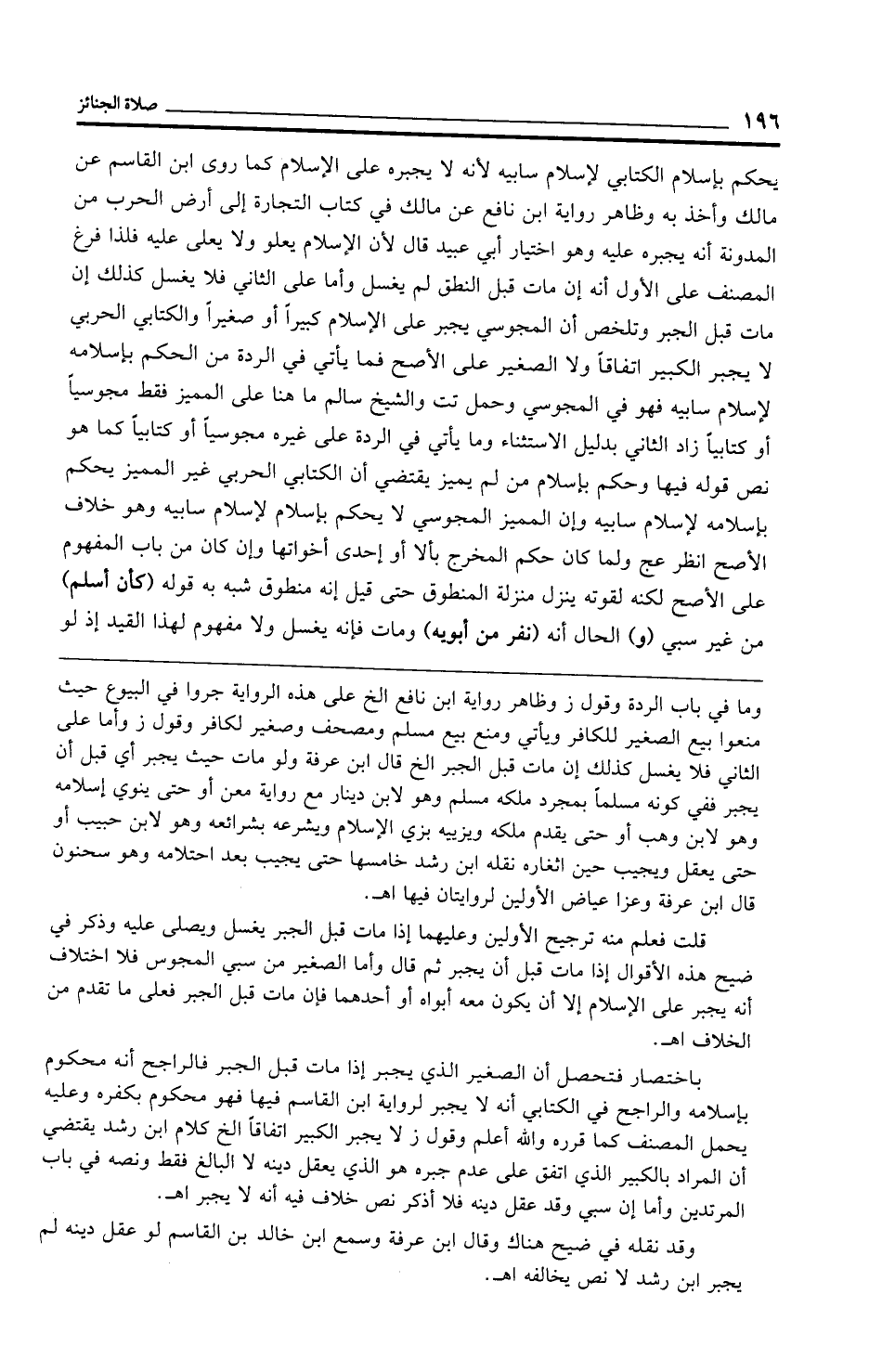 باختصار فتحصل أن الصغير الذي يجبر إذا مات قبل الجبر فالراجح أنه محكوم بإسلامه والراجح في الكتابي أنه لا يجبر لرواية ابن القاسم فيها فهو محكوم بكفره وعليه يحمل المصنف كما قرره والله أعلم وقول ز لا يجبر الكبير اتفاقًا الخ كلام ابن رشد يقتضي أن المراد بالكبير الذي اتفق على عدم جبره هو الذي يعقل دينه لا البالغ فقط ونصه في باب المرتدين وأما إن سبي وقد عقل دينه فلا أذكر نص خلاف فيه أنه لا يجبر اهـ.