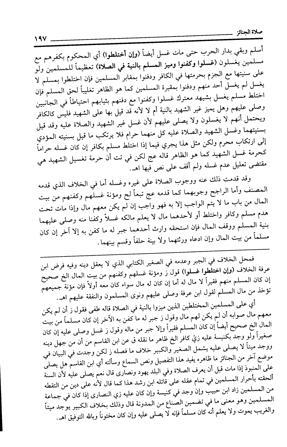 أسلم وبقي بدار الحرب حتى مات غسل أيضًا (وإن اختلطوا) أي المحكوم بكفرهم مع مسلمين يغسلون (غسلوا وكفنوا وميز المسلم بالنية في الصلاة) تعظيمًا للمسلمين ولو على سنيتها مع الجزم بحرمتها في الكافر ودفنوا بمقابر المسلمين فإن اختلطوا بمسلم لا يغسل لم يغسل أحد منهم ودفنوا بمقبرة المسلمين كما هو الظاهر تغليبًا لحق المسلم فإن اختلط مسلم يغسل بشهيد معترك غسلوا وكفنوا مع دفنهم بثيابهم احتياطًا في الجانبين وصلى عليهم وهل يميز غير الشهيد بالنية أم لا لأنه قد قيل بها على الشهيد فليس كالكافر ويحتمل أنهم لا يغسلون ولا يصلى عليهم لأن غسل غير الشهيد والصلاة عليه وقد قيل بسنيتهما وغسل الشهيد والصلاة عليه كل منهما حرام فلا يرتكب ما قيل بسنيته المؤدي إلى ارتكاب محرم ولكن مثل هذا يجري فيما إذا اختلط مسلم بكافر إن كان غسله حرامًا كحرمة غسل الشهيد كما هو الظاهر قاله عج لكن في تت أن حرمة تغسيل الشهيد هي مقتضى تعليل عدم غسله ولم أقف على نص فيها اهـ.
