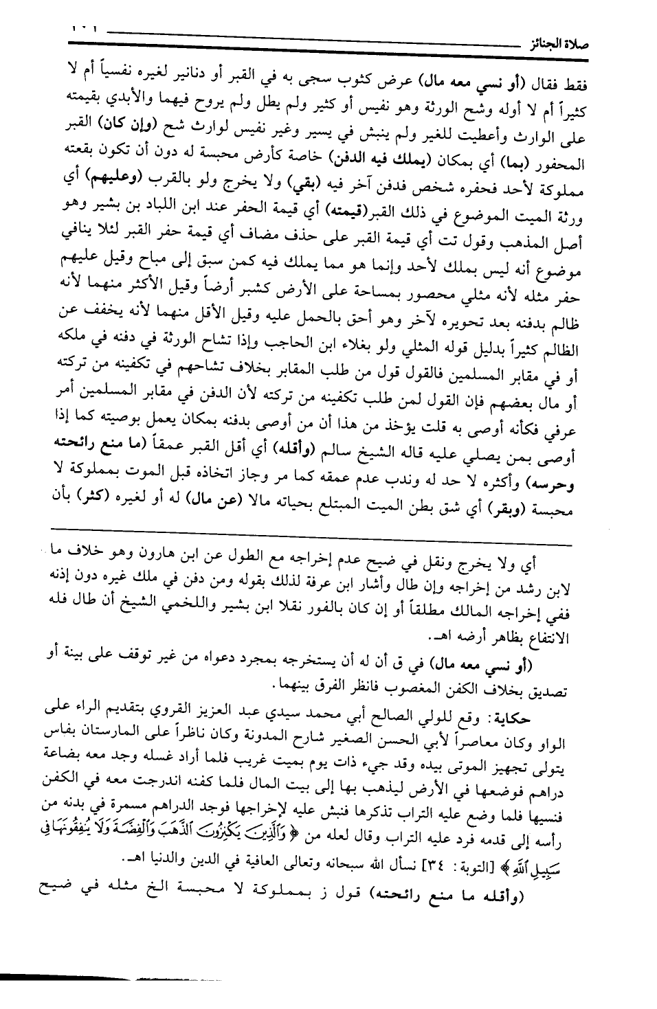 حكاية: وقع للولي الصالح أبي محمَّد سيدي عبد العزيز القروي بتقديم الراء على الواو وكان معاصرًا لأبي الحسن الصغير شارح المدونة وكان ناظرًا على المارستان بفاس يتولى تجهيز الموتى بيده وقد جيء ذات يوم بميت غريب فلما أراد غسله وجد معه بضاعة دراهم فوضعها في الأرض ليذهب بها إلى بيت المال فلما كفنه اندرجت معه في الكفن فنسيها فلما وضع عليه التراب تذكرها فنبش عليه لإخراجها فوجد الدراهم مسمرة في بدنه من رأسه إلى قدمه فرد عليه التراب وقال لعله من {وَالَّذِينَ يَكْنِزُونَ الذَّهَبَ وَالْفِضَّةَ وَلَا يُنْفِقُونَهَا فِي سَبِيلِ اللَّهِ} [التوبة: 34] نسأل الله سبحانه وتعالى العافية في الدين والدنيا اهـ.