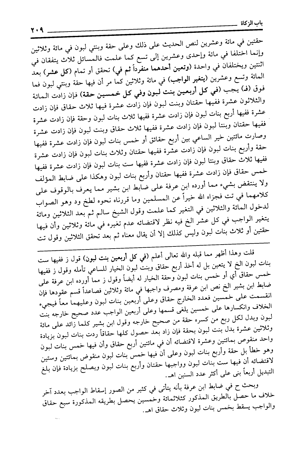 قلت وهذا أظهر مما قبله والله تعالى أعلم (في كل أربعين بنت لبون) قول ز ففيها ست بنات لبون الخ لا يتعين بل له أخذ أربع حقاق وبنت لبون الخيار للساعي تأمله وقول ز ففيها خمس حقاق أي أو خمس بنات لبون وحقة الخيار له أيضًا وقول ز مما أورده ابن عرفة على ضابط ابن بشير الخ نص ابن عرفة ومصرف واجبها في مائة وثلاثين فصاعدًا قسم عقودها فإن انقسمت على خمسين فعدد الخارج حقاق وعلى أربعين بنات لبون وعليهما معًا فيجيء الخلاف وانكسارها على خمسين يلغى قسمها وعلى أربعين الواجب عدد صحيح خارجه بنت لبون وبدل لكل ربع من كسره حقة من صحيح خارجه وقول ابن بشير كلما زائد على مائة وثلاثين عشرة بدل بنت لبون بحقة فإن زاد بعد حصول كلها حقاقًا ردت بنات لبون بزيادة واحد منقوص بمائتين وعشرة لاقتضائه أن في مائتين أربع حقاق وأن فيها خمس بنات لبون وهو خطأ بل حقة وأربع بنات لبون وعلى أن فيها خمس بنات لبون منقوض بمائتين وستين لاقتضائه أن فيها ست بنات لبون وواجبها حقتان وأربع بنات لبون ويصلح بزيادة فإن بلغ التبديل أربعًا بنى على أكثر عدد السنين اهـ.