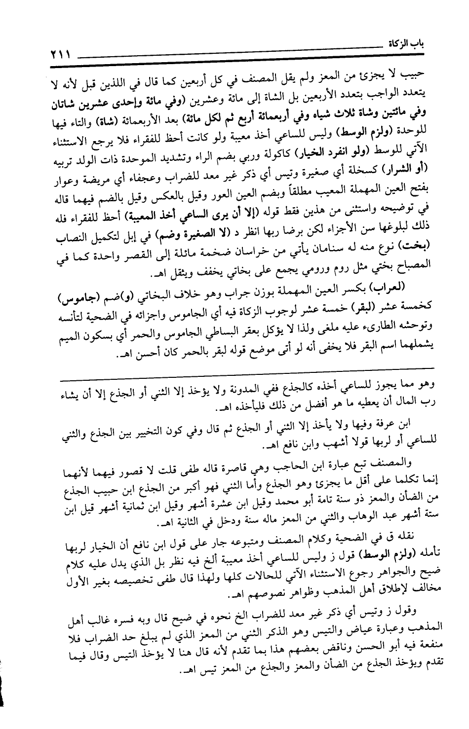 حبيب لا يجزئ من المعز ولم يقل المصنف في كل أربعين كما قال في اللذين قبل لأنه لا يتعدد الواجب بتعدد الأربعين بل الشاة إلى مائة وعشرين (وفي مائة وإحدى عشرين شاتان وفي مائتين وشاة ثلاث شياه وفي أربعمائة أربع ثم لكل مائة) بعد الأربعمائة (شاة) والتاء فيها للوحدة (ولزم الوسط) وليس للساعي أخذ معيبة ولو كانت أحظ للفقراء فلا يرجع الاستثناء الآتي للوسط (ولو انفرد الخيار) كاكولة وربي بضم الراء وتشديد الموحدة ذات الولد تربيه (أو الشرار) كسخلة أي صغيرة وتيس أي ذكر غير معد للضراب وعجفاء أي مريضة وعوار بفتح العين المهملة المعيب مطلقًا وبضم العين العور وقيل بالعكس وقيل بالضم فيهما قاله في توضيحه واستثنى من هذين فقط قوله (إلا أن يرى الساعي أخذ المعيبة) أحظ للفقراء فله ذلك لبلوغها سن الأجزاء لكن برضا ربها انظر د (لا الصغيرة وضم) في إبل لتكميل النصاب (بخت) نوع منه له سنامان يأتي من خراسان ضخمة مائلة إلى القصر واحدة كما في المصباح بختي مثل روم ورومي يجمع على بخاتي يخفف ويثقل اهـ.