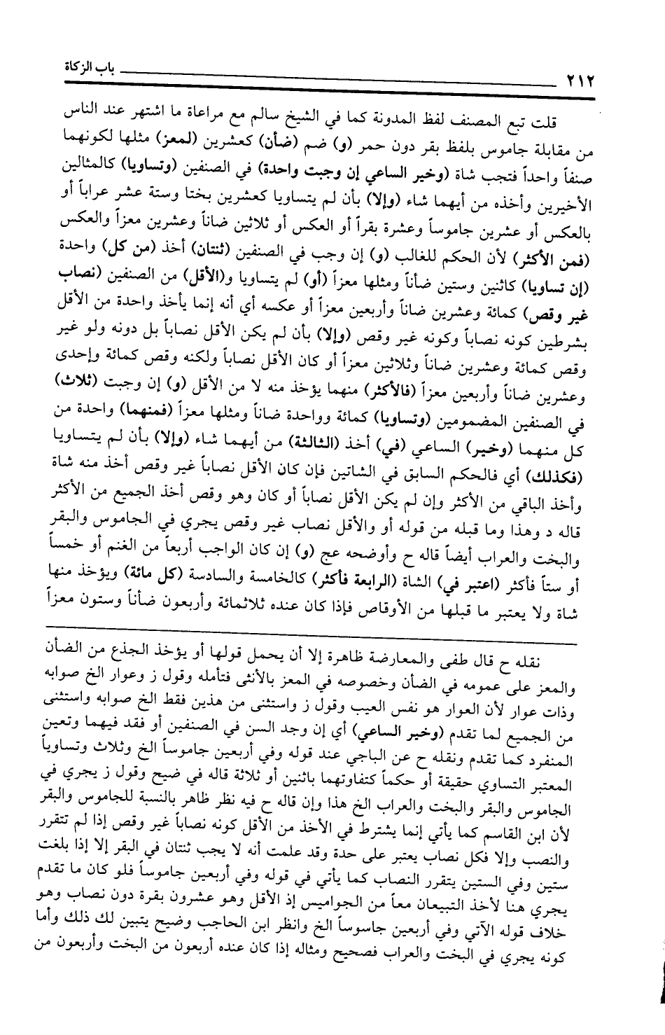 قلت تبع المصنف لفظ المدونة كما في الشيخ سالم مع مراعاة ما اشتهر عند الناس من مقابلة جاموس بلفظ بقر دون حمر (و) ضم (ضأن) كعشرين (لمعز) مثلها لكونهما صنفًا واحدًا فتجب شاة (وخير الساعي إن وجبت واحدة) في الصنفين (وتساويا) كالمثالين الأخيرين وأخذه من أيهما شاء (وإلا) بأن لم يتساويا كعشرين بختا وستة عشر عرابًا أو بالعكس أو عشرين جاموسًا وعشرة بقرًا أو العكس أو ثلاثين ضانًا وعشرين معزًا والعكس (فمن الأكثر) لأن الحكم للغالب (و) إن وجب في المصنفين (ثنتان) أخذ (من كل) واحدة (إن تساويا) كاثنين وستين ضأنًا ومثلها معزًا (أو) لم يتساويا و (الأقل) من المصنفين (نصاب غير وقص) كمائة وعشرين ضانًا وأربعين معزًا أو عكسه أي أنه إنما يأخذ واحدة من الأقل بشرطين كونه نصابًا وكونه غير وقص (وإلا) بأن لم يكن الأقل نصابًا بل دونه ولو غير وقص كمائة وعشرين ضأنًا وثلاثين معزًا أو كان الأقل نصابًا ولكنه وقص كمائة وإحدى وعشرين ضأنًا وأربعين معزًا (فالأكثر) منهما يؤخذ منه لا من الأقل (و) إن وجبت (ثلاث) في الصنفين المضمومين (وتساويا) كمائة وواحدة ضأنًا ومثلها معزًا (فمنهما) واحدة من كل منهما (وخير) الساعي (في) أخذ (الثالثة) من أيهما شاء (وإلا) بأن لم يتساويا (فكذلك) أي فالحكم السابق في الشاتين فإن كان الأقل نصابًا غير وقص أخذ منه شاة وأخذ الباقي من الأكثر وإن لم يكن الأقل نصابًا أو كان وهو وقص أخذ الجميع من الأكثر قاله د وهذا وما قبله من قوله أو والأقل نصاب غير وقص يجري في الجاموس والبقر والبخت والعراب أيضًا قاله ح وأوضحه عج (و) إن كان الواجب أربعًا من الغنم أو خمسًا أو ستًّا فأكثر (اعتبر في) الشاة (الرابعة فأكثر) كالخامسة والسادسة (كل مائة) ويؤخذ منها شاة ولا يعتبر ما قبلها من الأوقاص فإذا كان عنده ثلاثمائة وأربعون ضأنًا وستون معزًا
