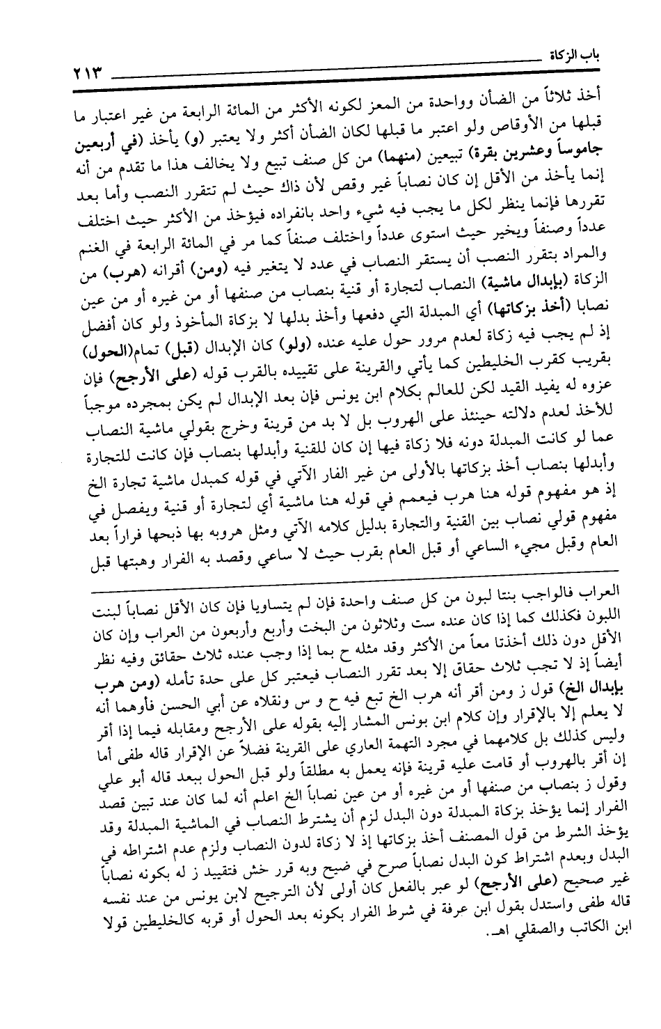 العراب فالواجب بنتا لبون من كل صنف واحدة فإن لم يتساويا فإن كان الأقل نصابًا لبنت اللبون فكذلك كما إذا كان عنده ست وثلاثون من البخت وأربع وأربعون من العراب وإن كان الأقل دون ذلك أخذتا معًا من الأكثر وقد مثله ح بما إذا وجب عنده ثلاث حقائق وفيه نظر أيضًا إذ لا تجب ثلاث حقاق إلا بعد تقرر النصاب فيعتبر كل على حدة تأمله (ومن هرب بإبدال الخ) قول ز ومن أقر أنه هرب الخ تبع فيه ح وس ونقلاه عن أبي الحسن فأوهما أنه لا يعلم إلا بالإقرار وإن كلام ابن يونس المشار إليه بقوله على الأرجح ومقابله فيما إذا أقر وليس كذلك بل كلامهما في مجرد التهمة العاري على القرينة فضلًا عن الإقرار قاله طفى أما إن أقر بالهروب أو قامت عليه قرينة فإنه يعمل به مطلقًا ولو قبل الحول ببعد قاله أبو علي وقول ز بنصاب من صنفها أو من غيره أو من عين نصابًا الخ اعلم أنه لما كان عند تبين قصد الفرار إنما يؤخذ بزكاة المبدلة دون البدل لزم أن يشترط النصاب في الماشية المبدلة وقد يؤخذ الشرط من قول المصنف أخذ بزكاتها إذ لا زكاة لدون النصاب ولزم عدم اشتراطه في البدل وبعدم اشتراط كون البدل نصابًا صرح في ضيح وبه قرر خش فتقييد ز له بكونه نصابًا غير صحيح (على الأرجح) لو عبر بالفعل كان أولى لأن الترجيح لابن يونس من عند نفسه قاله طفى واستدل يقول ابن عرفة في شرط الفرار بكونه بعد الحول أو قوبه كالخليطين قولا ابن الكاتب والصقلي اهـ.