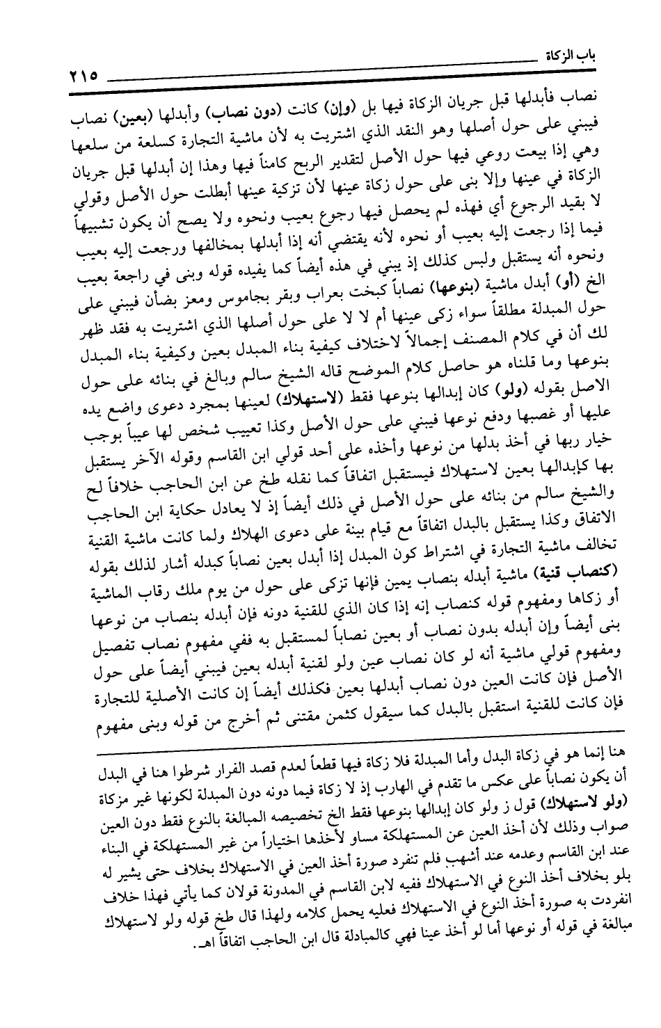 نصاب فأبدلها قبل جريان الزكاة فيها بل (وإن) كانت (دون نصاب) وأبدلها (بعين) نصاب فيبني على حول أصلها وهو النقد الذي اشتريت به لأن ماشية التجارة كسلعة من سلعها وهي إذا بيعت روعي فيها حول الأصل لتقدير الربح كامنًا فيها وهذا إن أبدلها قبل جريان الزكاة في عينها وإلا بنى على حول زكاة عينها لأن تزكية عينها أبطلت حول الأصل وقولي لا بقيد الرجوع أي فهذه لم يحصل فيها رجوع بعيب ونحوه ولا يصح أن يكون تشبيهًا فيما إذا رجعت إليه بعيب أو نحوه لأنه يقتضي أنه إذا أبدلها بمخالفها ورجعت إليه بعيب ونحوه أنه يستقبل ولبس كذلك إذ يبني في هذه أيضًا كما يفيده قوله وبنى في راجعة بعيب الخ (أو) أبدل ماشية (بنوعها) نصابًا كبخت بعراب وبقر بجاموس ومعز بضأن فيبني على حول المبدلة طلقًا سواء زكى عينها أم لا لا على حول أصلها الذي اشتريت به فقد ظهر لك أن في كلام المصنف إجمالًا لاختلاف كيفية بناء المبدل بعين وكيفية بناء المبدل بنوعها وما قلناه هو حاصل كلام الموضح قاله الشيخ سالم وبالغ في بنائه على حول الأصل بقوله (ولو) كان إبدالها بنوعها فقط (لاستهلاك) لمعينها بمجرد دعوى واضع يده عليها أو غصبها ودفع نوعها فيبني على حول الأصل وكذا تعييب شخص لها عيبًا بوجب خيار ربها في أخذ بدلها من نوعها وأخذه على أحد قولي ابن القاسم وقوله الآخر يستقبل بها كإبدالها بحين لاستهلاك فيستقبل اتفاقًا كما نقله طخ عن ابن الحاجب خلافًا لح والشيخ سالم من بنائه على حول الأصل في ذلك أيضًا إذ لا يعادل حكاية ابن الحاجب الاتفاق وكذا يستقبل بالبدل اتفاقًا مع قيام بينة على دعوى الهلاك ولما كانت ماشية القنية تخالف ماشية التجارة في اشتراط كون المبدل إذا أبدل بعين نصابًا كبدله أشار لذلك بقوله (كنصاب قنية) ماشية أبدله بنصاب يمين فإنها تزكى على حول من يوم ملك رقاب الماشية أو زكاها ومفهوم قوله كنصاب إنه إذا كان الذي للقنية دونه فإن أبدله بنصاب من نوعها بنى أيضًا وإن أبدله بدون نصاب أو بعين نصابًا لمستقبل به ففي مفهوم نصاب تفصيل ومفهوم قولي ماشية أنه لو كان نصاب عين ولو لقنية أبدله بعين فيبني أيضًا على حول الأصل فإن كانت العين دون نصاب أبدلها بعين فكذلك أيضًا إن كانت الأصلية للتجارة فإن كانت للقنية استقبل بالبدل كما سيقول كثمن مقتنى ثم أخرج من قوله وبنى مفهوم
