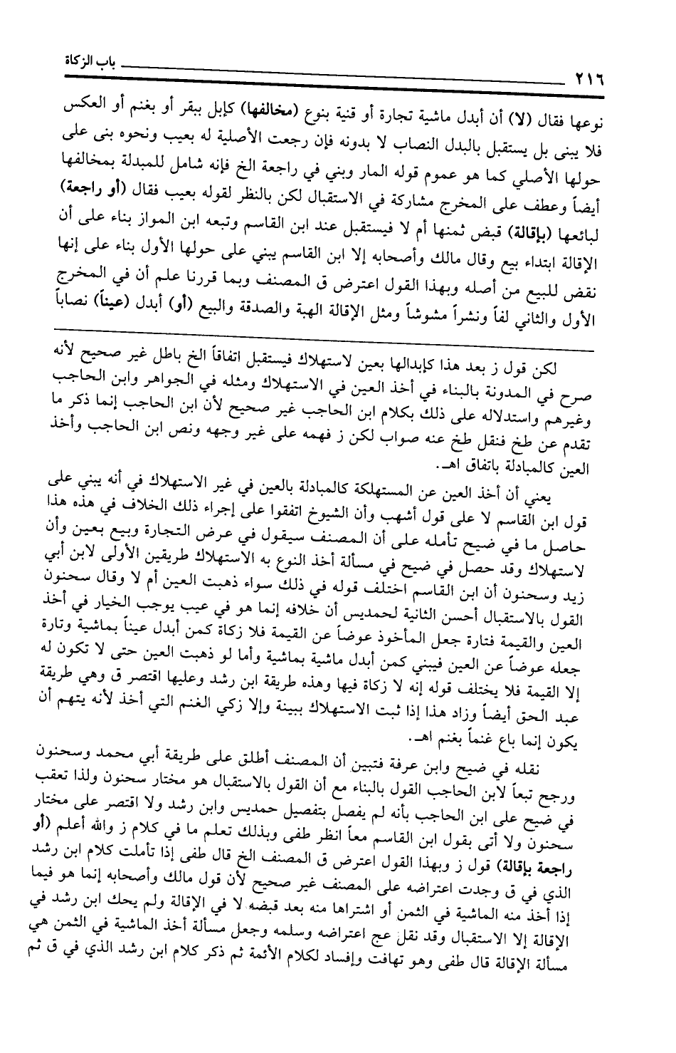 نقله في ضيح وابن عرفة فتبين أن المصنف أطلق على طريقة أبي محمَّد وسحنون ورجح تبعًا لابن الحاجب القول بالبناء مع أن القول بالاستقبال هو مختار سحنون ولذا تعقب في ضيح على ابن الحاجب بأنه لم يفصل بتفصيل حمديس وابن رشد ولا اقتصر على مختار سحنون ولا أتى يقول ابن القاسم معًا انظر طفى وبذلك تعلم ما في كلام ز والله أعلم (أو راجعة بإقالة) قول ز وبهذا القول اعترض ق المصنف الخ قال طفى إذا تأملت كلام ابن رشد الذي في ق وجدت اعتراضه على المصنف غير صحيح لأن قول مالك وأصحابه إنما هو فيما إذا أخذ منه الماشية في الثمن أو اشتراها منه بعد قبضه لا في الإقالة ولم يحك ابن رشد في الإقالة إلا الاستقبال وقد نقل عج اعتراضه وسلمه وجعل مسألة أخذ الماشية في الثمن هي مسألة الإقالة قال طفى وهو تهافت وإفساد لكلام الأئمة ثم ذكر كلام ابن رشد الذي في ق ثم