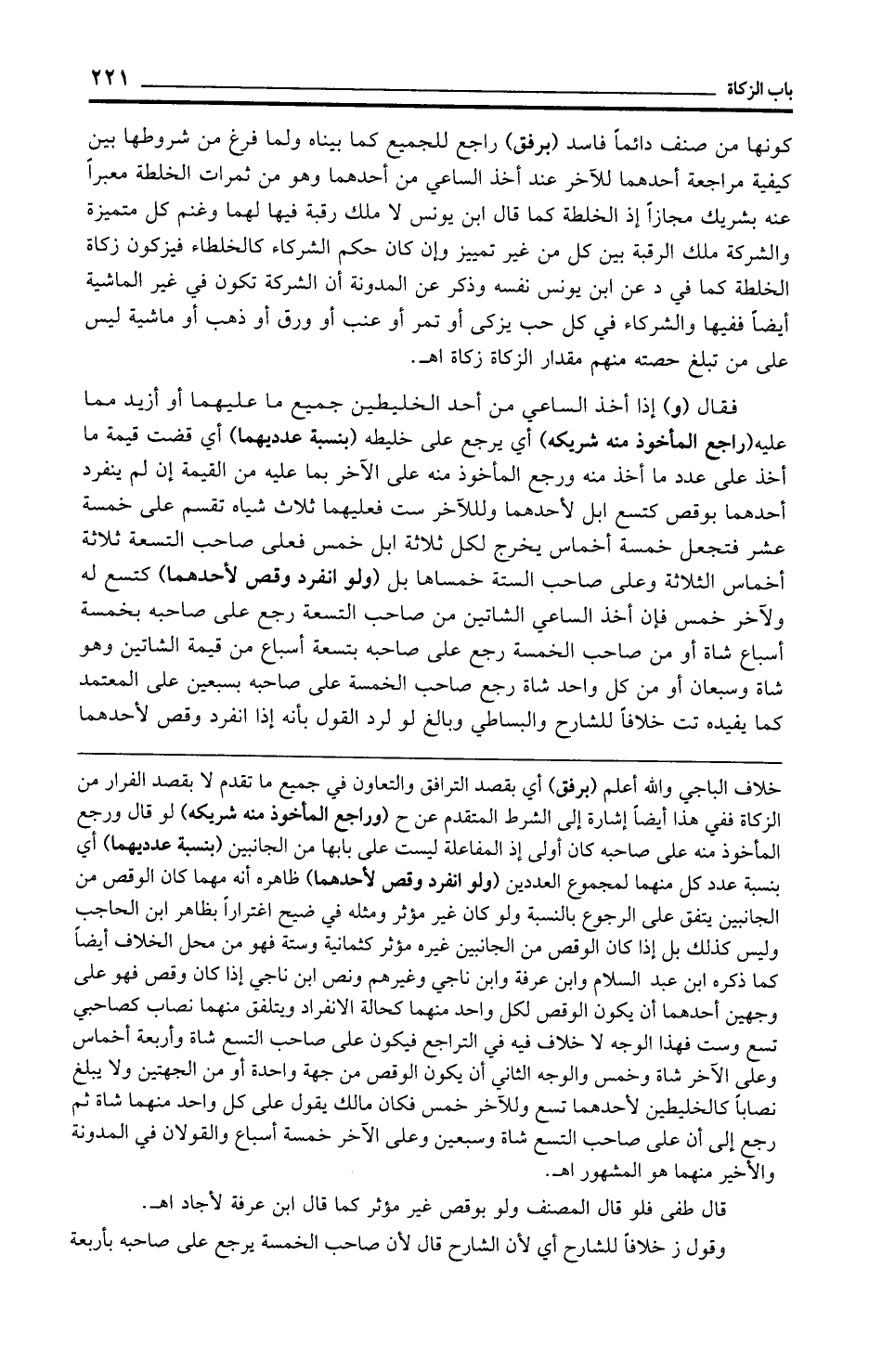 كونها من صنف دائمًا فاسد (برفق) راجع للجميع كما بيناه ولما فرغ من شروطها بين كيفية مراجعة أحدهما للآخر عند أخذ الساعي من أحدهما وهو من ثمرات الخلطة معبرًا عنه بشريك مجازًا إذ الخلطة كما قال ابن يونس لا ملك رقبة فيها لهما وغنم كل متميزة والشركة ملك الرقبة بين كل من غير تمييز وإن كان حكم الشركاء كالخلطاء فيزكون زكاة الخلطة كما في د عن ابن يونس نفسه وذكر عن المدونة أن الشركة تكون في غير الماشية أيضًا ففيها والشركاء في كل حب يزكى أو تمر أو عنب أو ورق أو ذهب أو ماشية ليس على من تبلغ حصته منهم مقدار الزكاة زكاة اهـ.