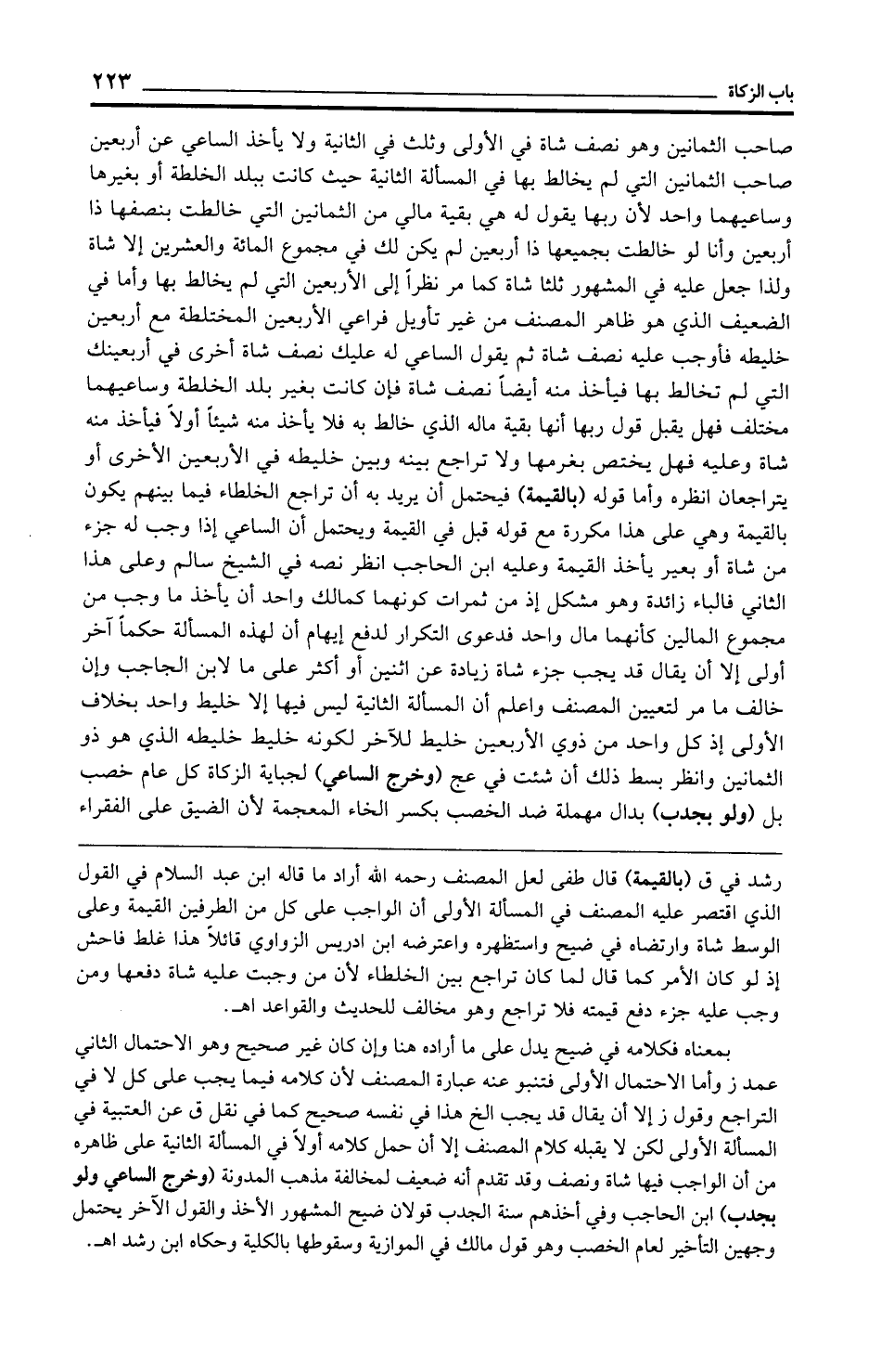 رشد في ق (بالقيمة) قال طفى لعل المصنف رحمه الله أراد ما قاله ابن عبد السلام في القول الذي اقتصر عليه المصنف في المسألة الأولى أن الواجب على كل من الطرفين القيمة وعلى الوسط شاة وارتضاه في ضيح واستظهره واعترضه ابن إدريس الزواوي قائلًا هذا غلط فاحش إذ لو كان الأمر كما قال لما كان تراجع بين الخلطاء لأن من وجبت عليه شاة دفعها ومن وجب عليه جزء دفع قيمته فلا تراجع وهو مخالف للحديث والقواعد اهـ.