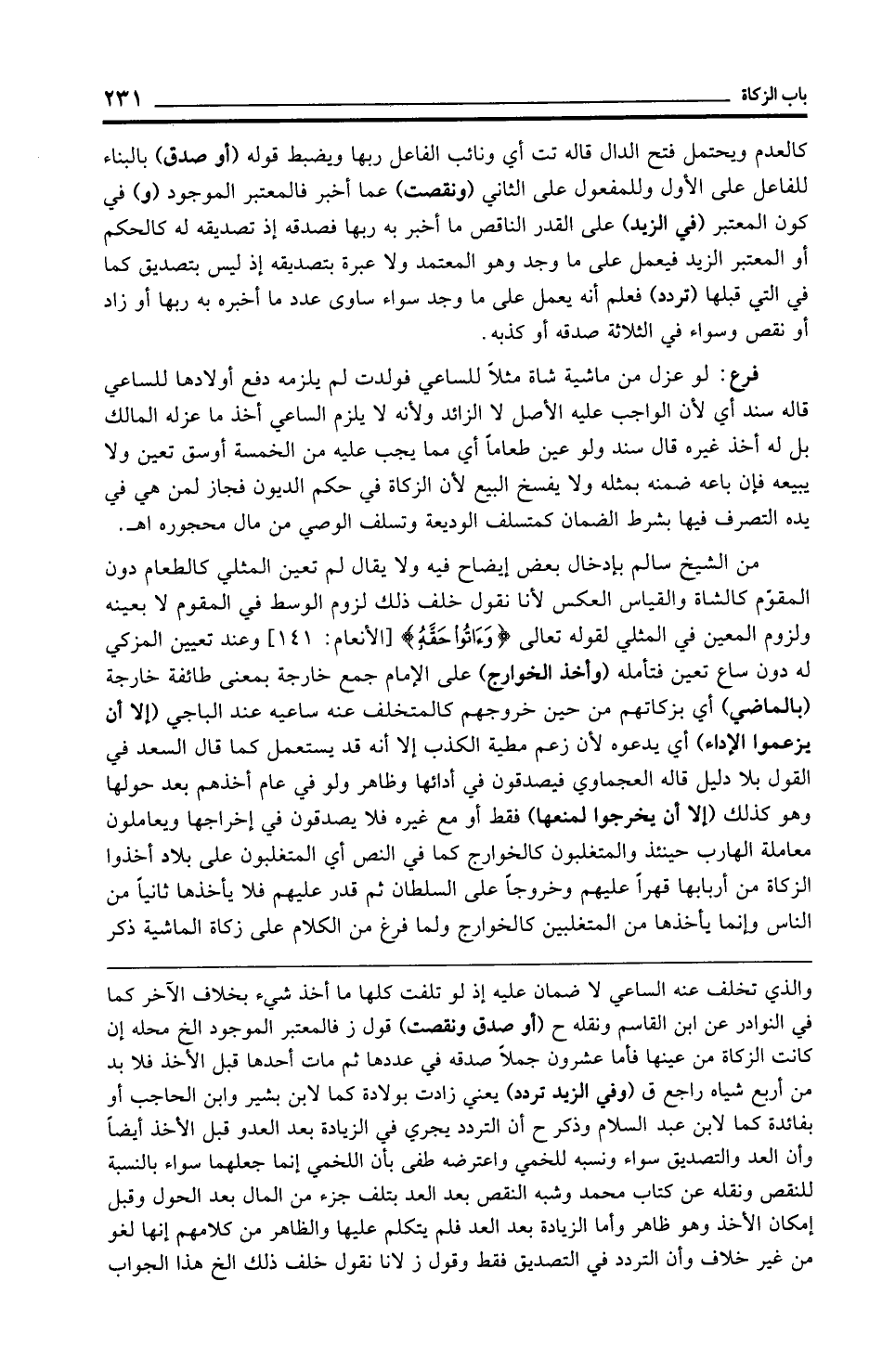 من الشيخ سالم بإدخال بعض إيضاح فيه ولا يقال لم تعين المثلي كالطعام دون المقوّم كالشاة والقياس العكس لأنا نقول خلف ذلك لزوم الوسط في المقوم لا بعينه ولزوم المعين في المثلي لقوله تعالى {وَآتُوا حَقَّهُ} [الأنعام: 141] وعند تعيين المزكي له دون ساع تعين فتأمله (وأخذ الخوارج) على الإِمام جمع خارجة بمعنى طائفة خارجة (بالماضي) أي بزكاتهم من حين خروجهم كالمتخلف عنه ساعيه عند الباجي (إلا أن يزعموا الأداء) أي يدعوه لأن زعم مطية الكذب إلا أنه قد يستعمل كما قال السعد في القول بلا دليل قاله العجماوي فيصدقون في أدائها وظاهر ولو في عام أخذهم بعد حولها وهو كذلك (إلا أن يخرجوا لمنعها) فقط أو مع غيره فلا يصدقون في إخراجها ويعاملون معاملة الهارب حينئذ والمتغلبون كالخوارج كما في النص أي المتغلبون على بلاد أخذوا الزكاة من أربابها قهرًا عليهم وخروجًا على السلطان ثم قدر عليهم فلا يأخذها ثانيًا من الناس وإنما يأخذها من المتغلبين كالخوارج ولما فرغ من الكلام على زكاة الماشية ذكر