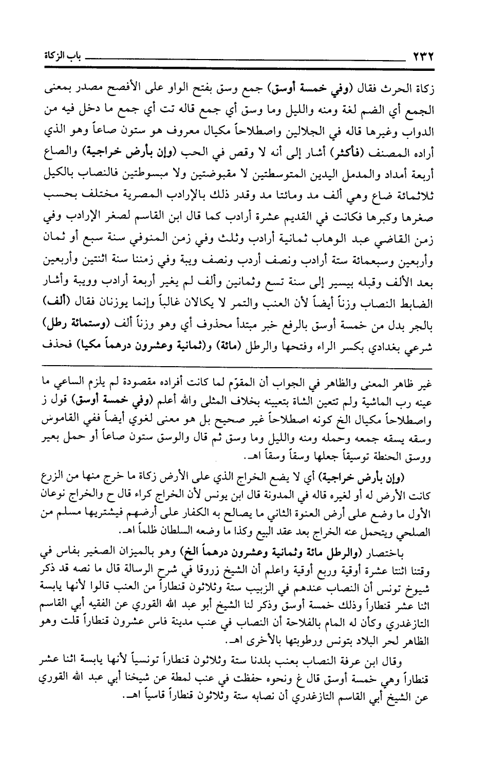 باختصار (والرطل مائة وثمانية وعشرون درهمًا الخ) وهو بالميزان الصغير بفاس في وقتنا اثنتا عشرة أوقية وربع أوقية واعلم أن الشيخ زروقا في شرح الرسالة قال ما نصه قد ذكر شيوخ تونس أن النصاب عندهم في الزبيب ستة وثلاثون قنطارًا من العنب قالوا لأنها يابسة اثنا عشر قنطارًا وذلك خمسة أوسق وذكر لنا الشيخ أبو عبد الله القوري عن الفقيه أبي القاسم التازغدري وكأن له المام بالفلاحة أن النصاب في عنب مدينة فاس عشرون قنطارًا قلت وهو الظاهر لحر البلاد بتونس ورطوبتها بالأخرى اهـ.